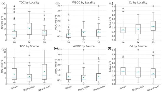 Spatial variation in (a) TOC, (b) WEOC, and (c) Cd by locality and (d) TOC, (e) WEOC, and (f) Cd by waterbody type (streams, drying ditches, natural ponds). Boxplots show the median (horizontal line), interquartile range (boxes), and 1.5 × IQR (whiskers). Open circles represent individual observations outside the whisker range (outliers), while triangles indicate mean values.