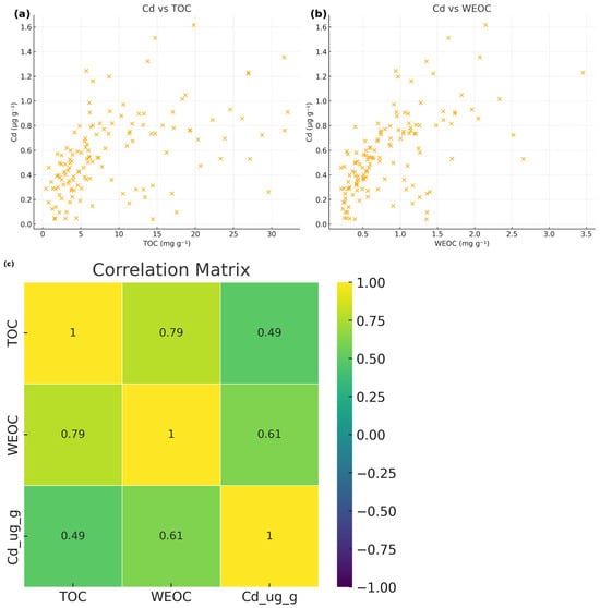 Relationships between cadmium and organic carbon pools in sediments: (a) Cd versus TOC, (b) Cd versus WEOC, and (c) Spearman correlation matrix for TOC, WEOC, and Cd.