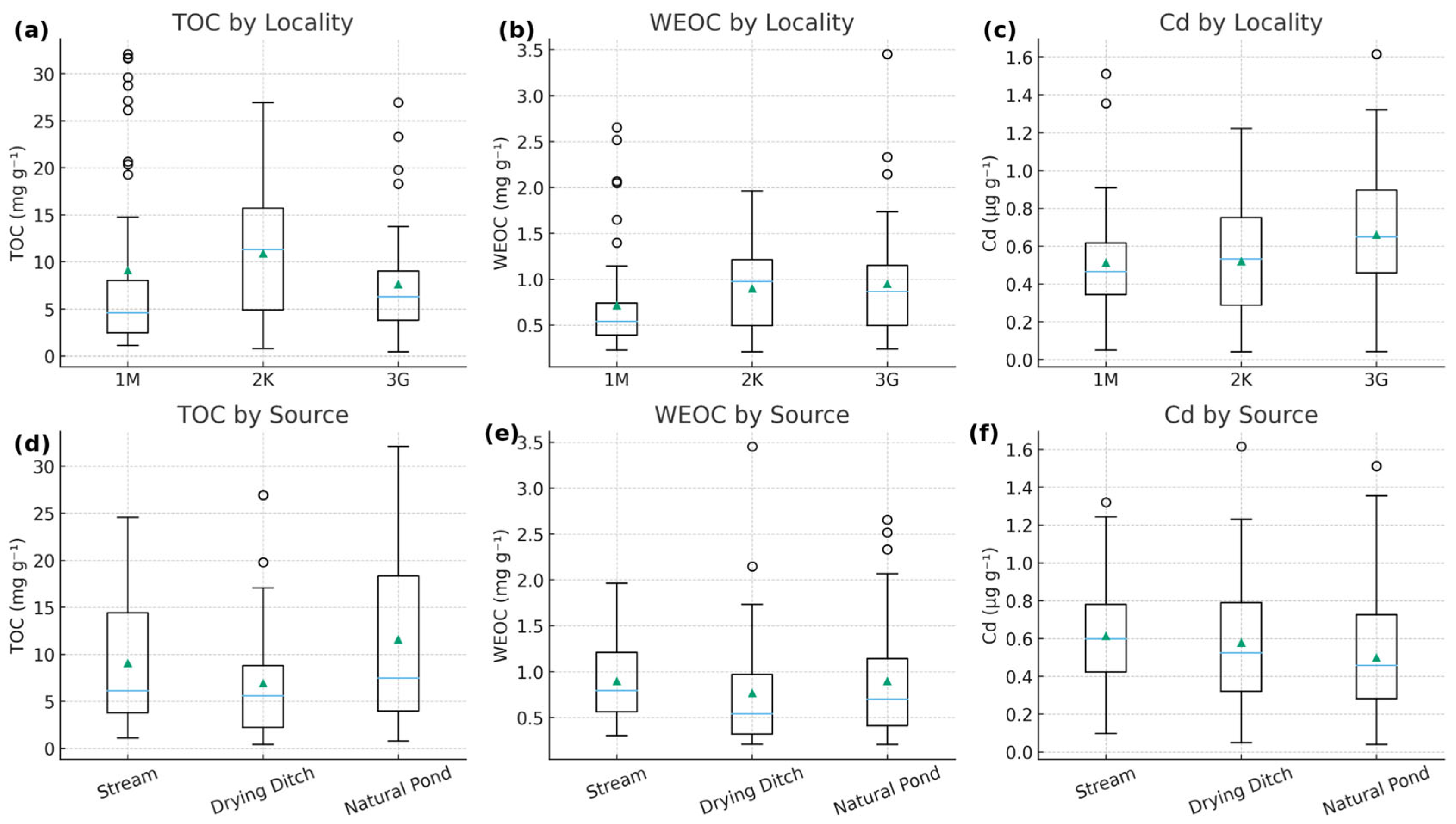 - Examine spatial differences in TOC, WEOC, and Cd among waterbody types (streams, natural ponds, and drying ditches) and across regions with contrasting land-use intensity;