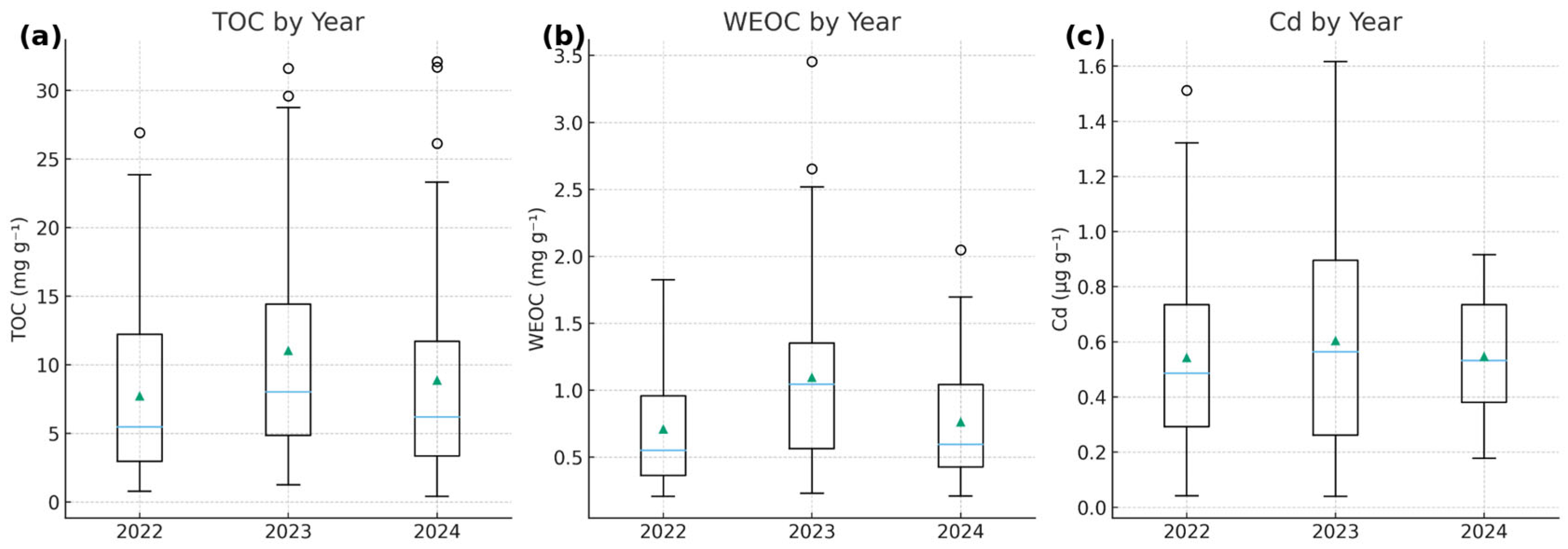 3.1. Spatial Patterns of TOC, WEOC and Cd