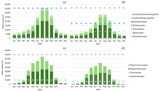 Lisbon faces water scarcity resulting from increased water demand (growing population and economy) and impacts of climate change (namely, drought, heat islands, and heat waves). The water exploitation index plus (WEI+) provides an overview on water scarcity, quantifying the renewable water resources and the water used for consumptive uses at a monthly time step [34]. Lisbon is in the sub-basin Tagus (Portuguese river basin district number 5), for which the WEI+ value calculated for 1930–2015 from July to September (0.77) indicates high water stress during the summer period [35].