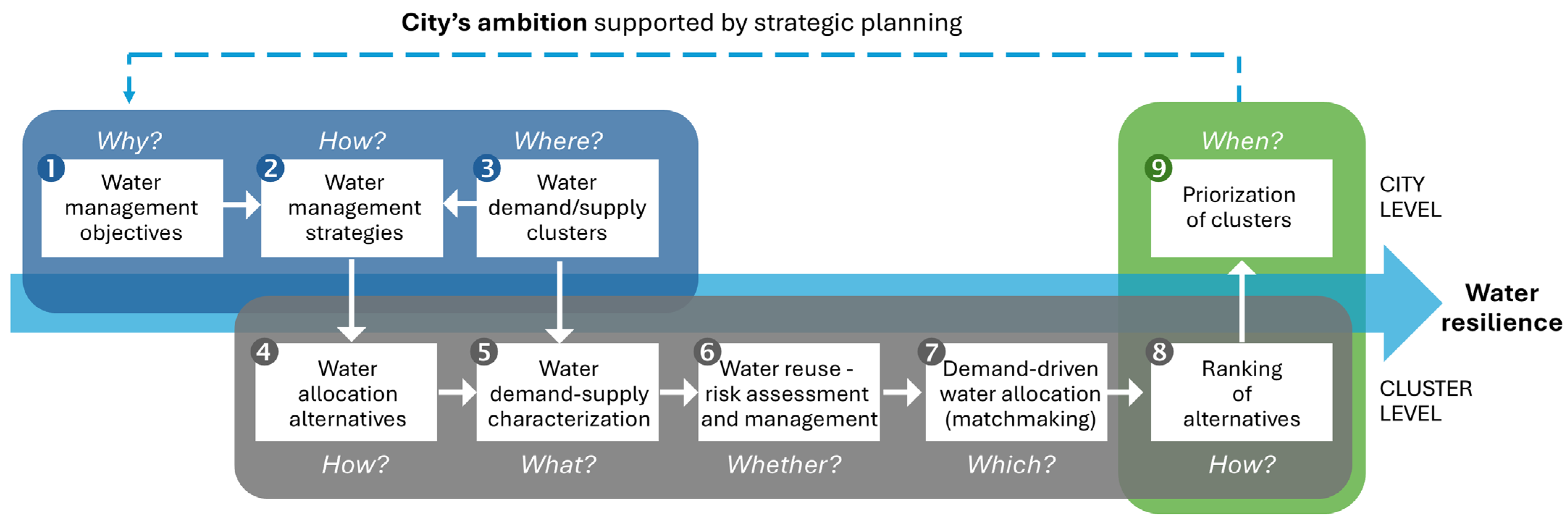 The Smart Water Allocation Process (SWAP) guides the decision-makers and other stakeholders in the stepwise application of the smart water allocation framework, and integrates a two-scale analysis—city level and cluster level. The step-by-step approach supports a clear definition of objectives and the exploration of multiple alternatives before selecting a solution. The two-level analysis allows for understanding first the large-scale water management challenges (city level) and then defining tailored interventions within sub-areas in the city (cluster level), for guiding a structured definition for the course of action to improve local water resilience (city level).