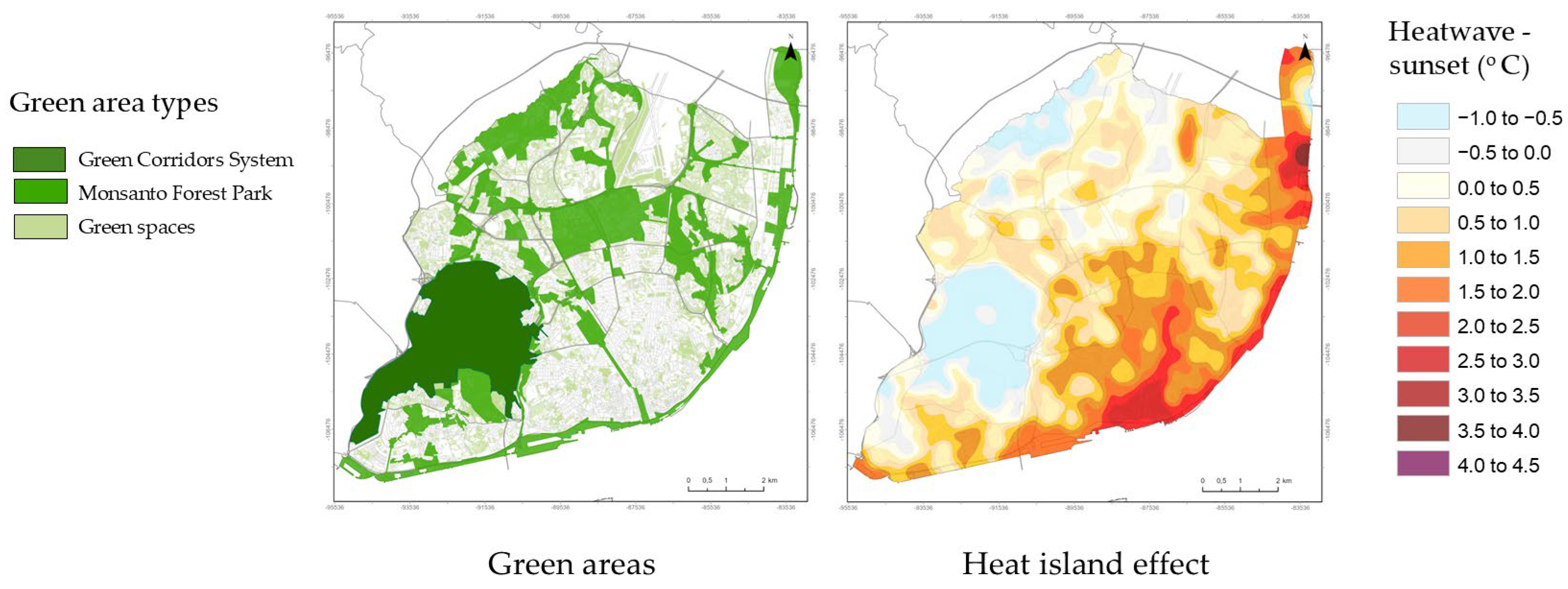 Lisbon is also the largest city of Portugal, with 100 km2 in total area. Its green areas include parks, gardens, remnants of farming lots, and roadway separators. Several of these green areas are connected through green corridors. These green corridors promote biodiversity, ecological connectivity and human well-being in the city, in addition to limiting the urban heat island effect [32]. Figure 2 illustrates the beneficial effect of green areas on air temperature during sunset; in general, heat islands tend to occur in the areas of Lisbon with lower vegetation density. This observation is in line with the conclusions of a study in the city of Porto (Portugal) [33].