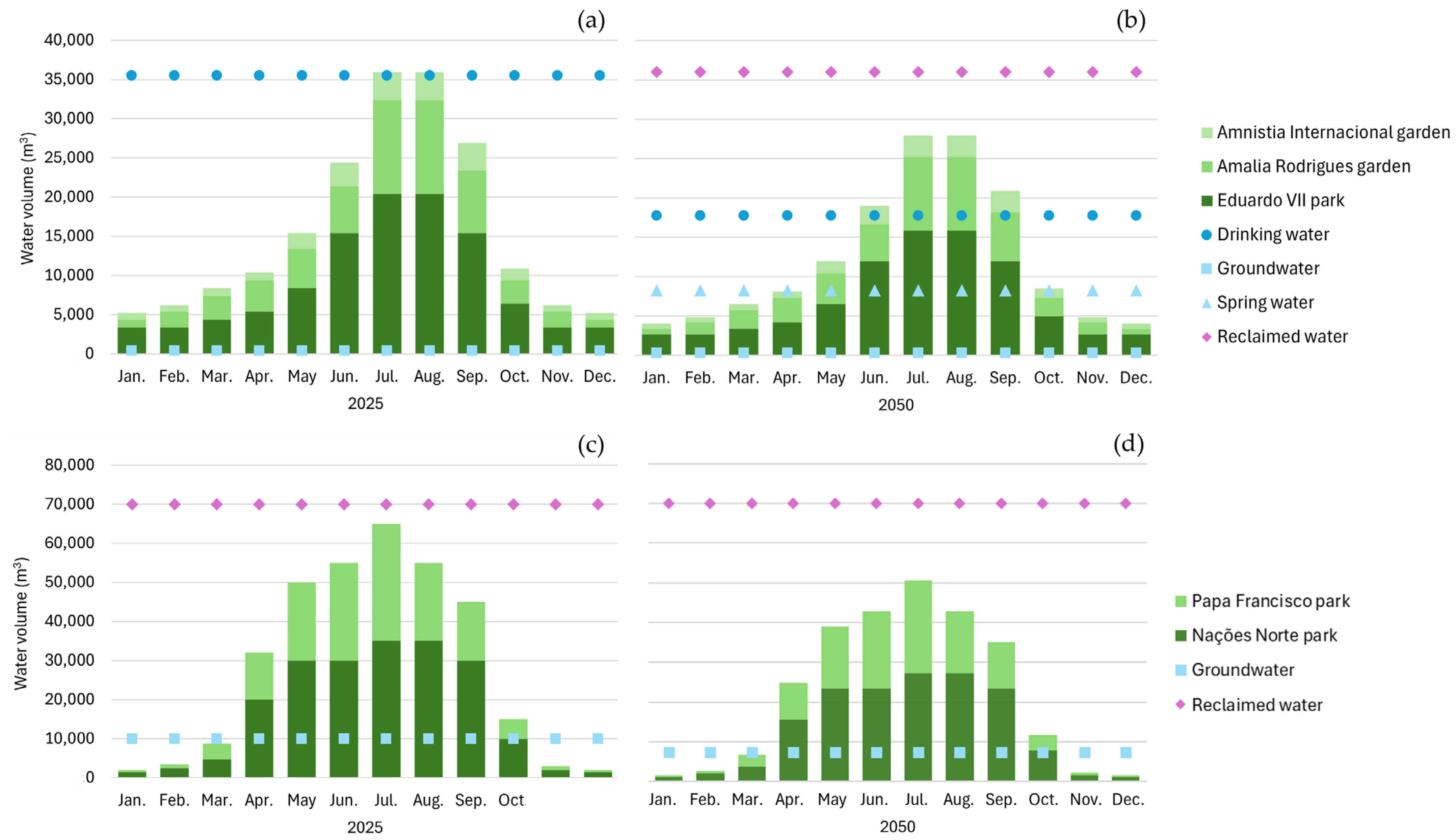 Lisbon faces water scarcity resulting from increased water demand (growing population and economy) and impacts of climate change (namely, drought, heat islands, and heat waves). The water exploitation index plus (WEI+) provides an overview on water scarcity, quantifying the renewable water resources and the water used for consumptive uses at a monthly time step [34]. Lisbon is in the sub-basin Tagus (Portuguese river basin district number 5), for which the WEI+ value calculated for 1930–2015 from July to September (0.77) indicates high water stress during the summer period [35].