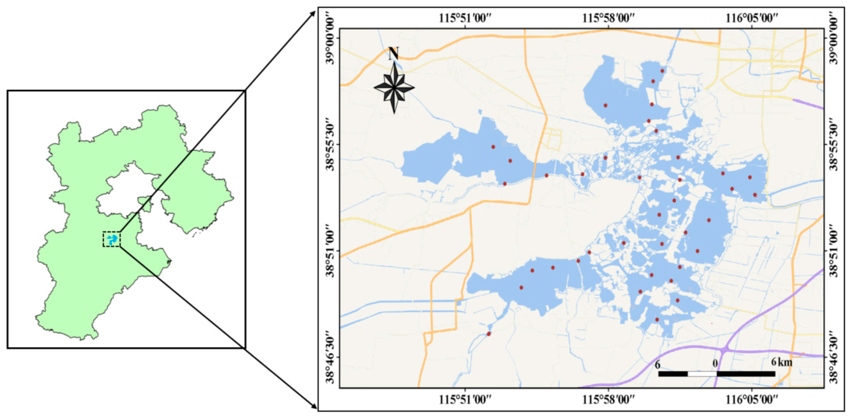 - Baiyangdian Ecological Environment Management and Protection Plan (2018–2035). People’s Government of Hebei Province, China. 2019. Available online: https://global.chinadaily.com.cn/a/201901/07/WS5c329142a31068606745f1f1.html (accessed on 1 December 2025).
