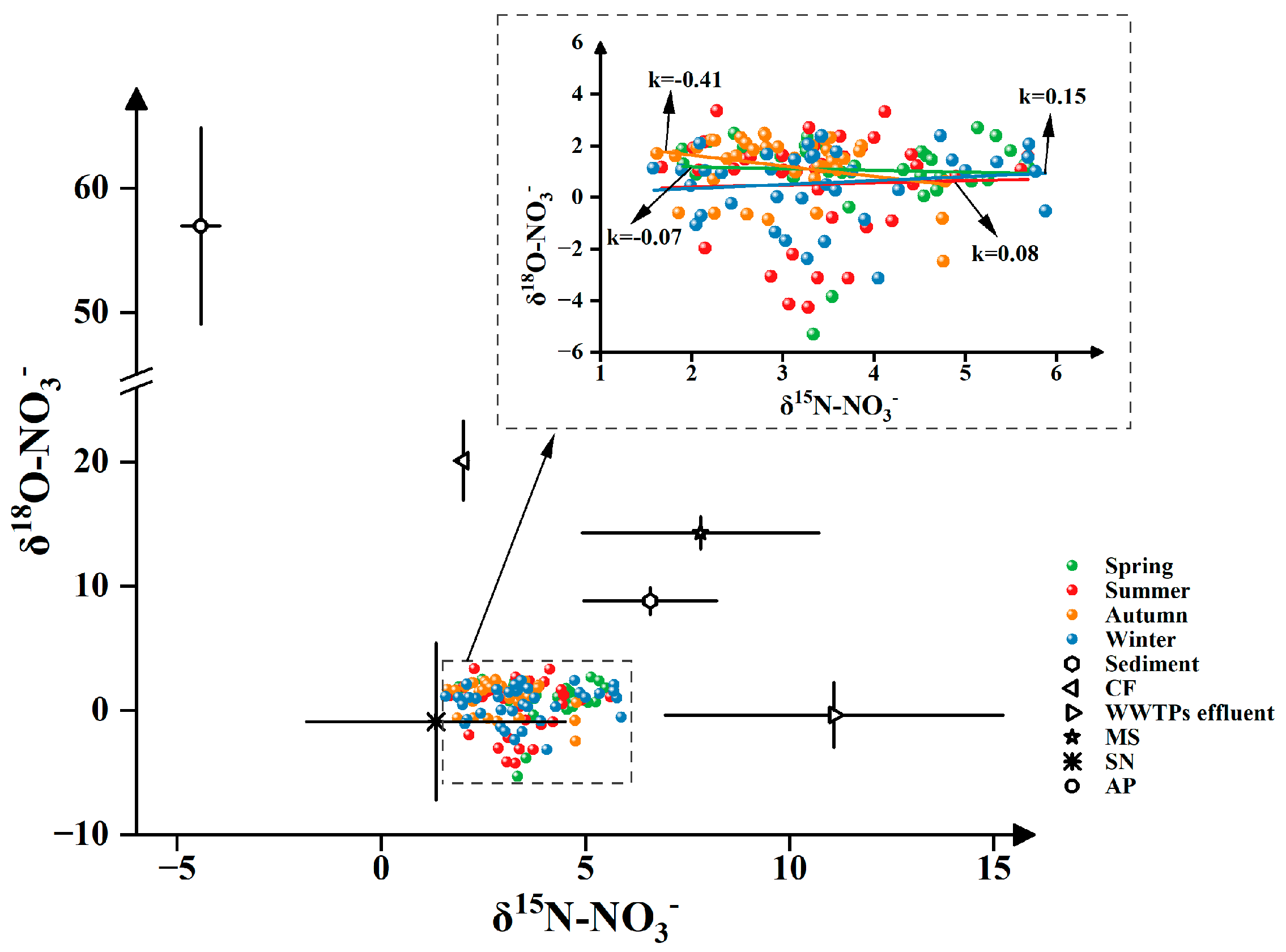 | Water | δ15N-NO3− (‰) | δ18O-NO3− (‰) | ||||