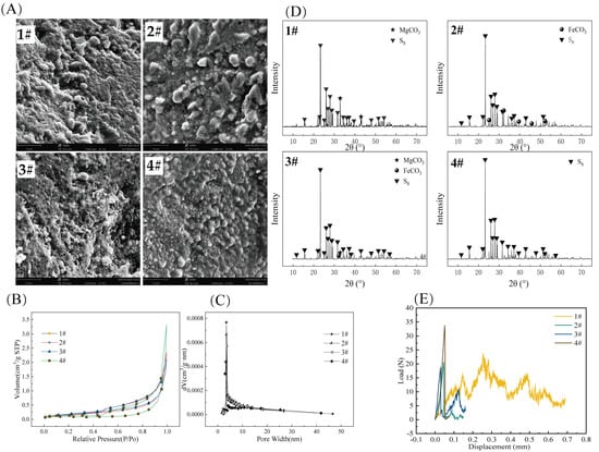 (A) SEM photographs, (B) adsorption–desorption isotherm curves, (C) pore size distribution curves, (D) XRD patterns, and (E) compressive strength of the four types of S0-CFs (1#, 2#, 3#, and 4#).