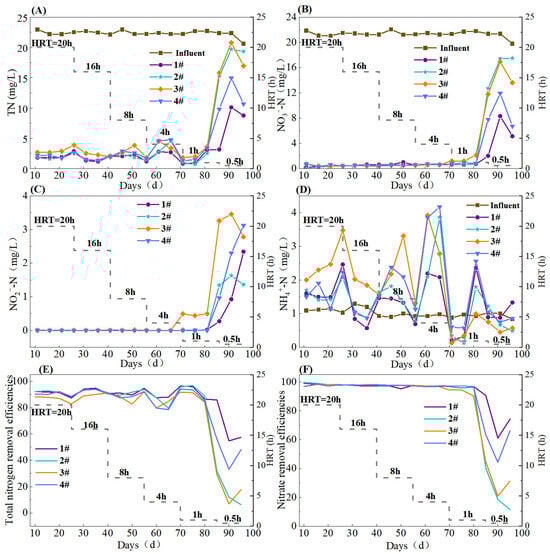 Nitrogen removal efficacy of S0-CF 1#–4# reactors ((A) TN, (B) NO3−-N, (C) NO2−-N, (D) NH4+-N, (E) TN removal efficiency, (F) NO3−-N removal efficiency).