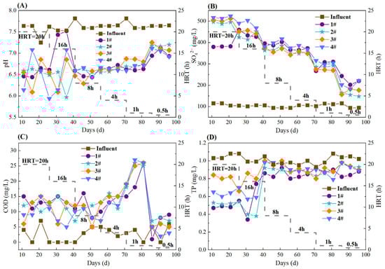 Variations in water quality parameters in S0-CF 1#–4# reactors. (A) Variations in effluent pH; (B) Effluent SO42− concentrations; (C) Effluent COD concentrations; (D) Effluent TP concentrations.