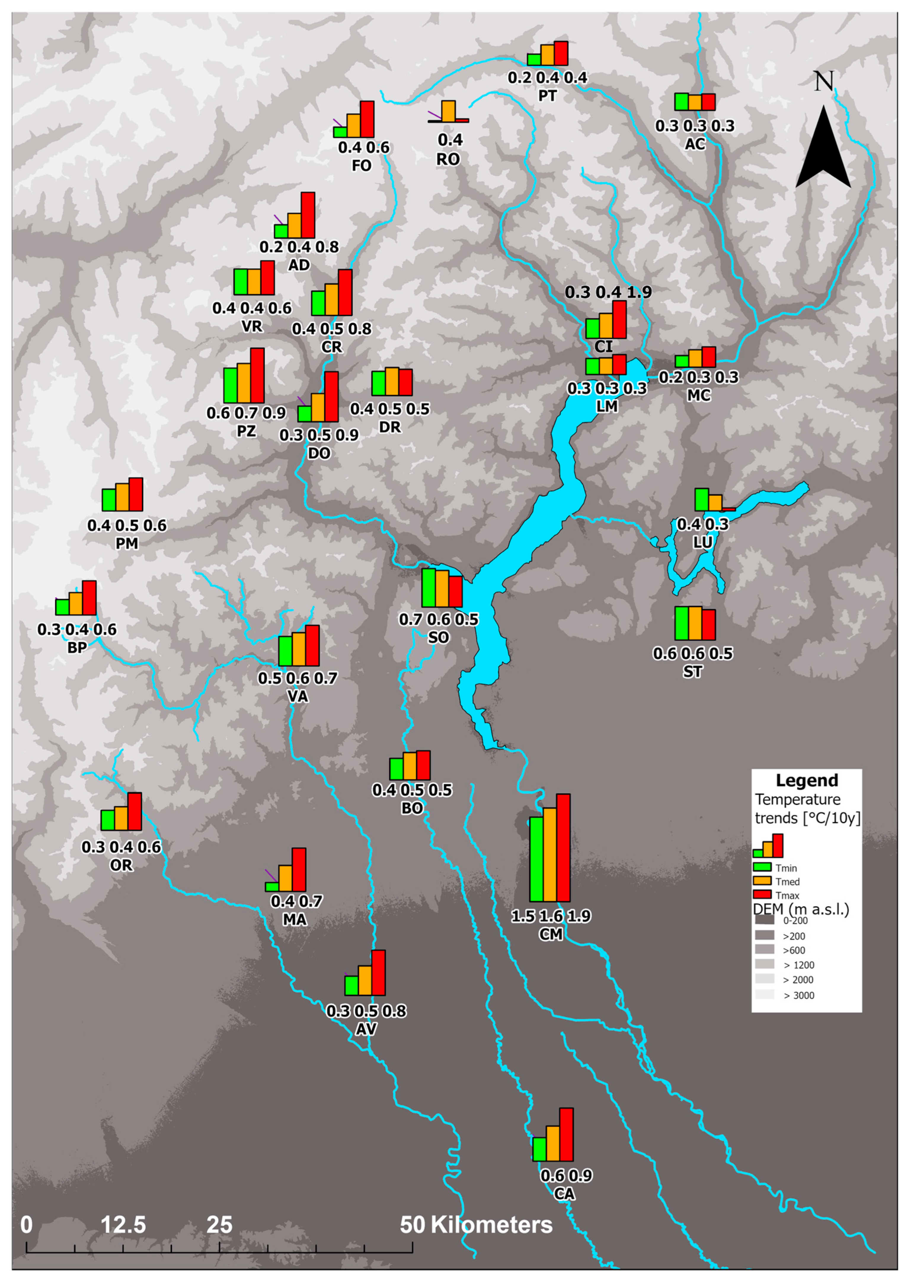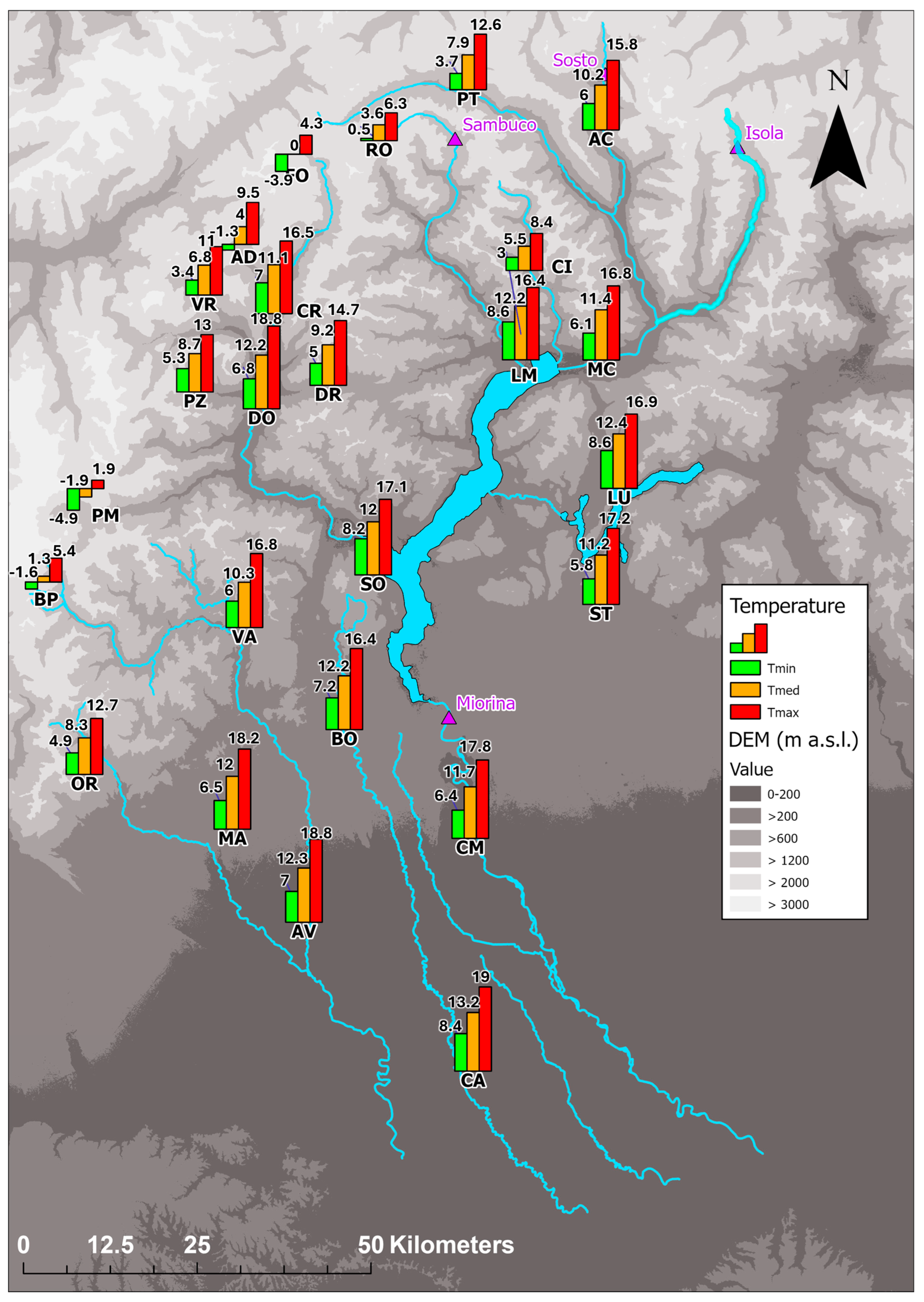 - Stucchi, L.; Dresti, C.; Bocchiola, D. Centenary (1930–2023) Climate, and Snow Cover Changes in the Western Alps of Italy. The Ossola Valley. Clim. Change 2023, 176, 78. [Google Scholar] [CrossRef]