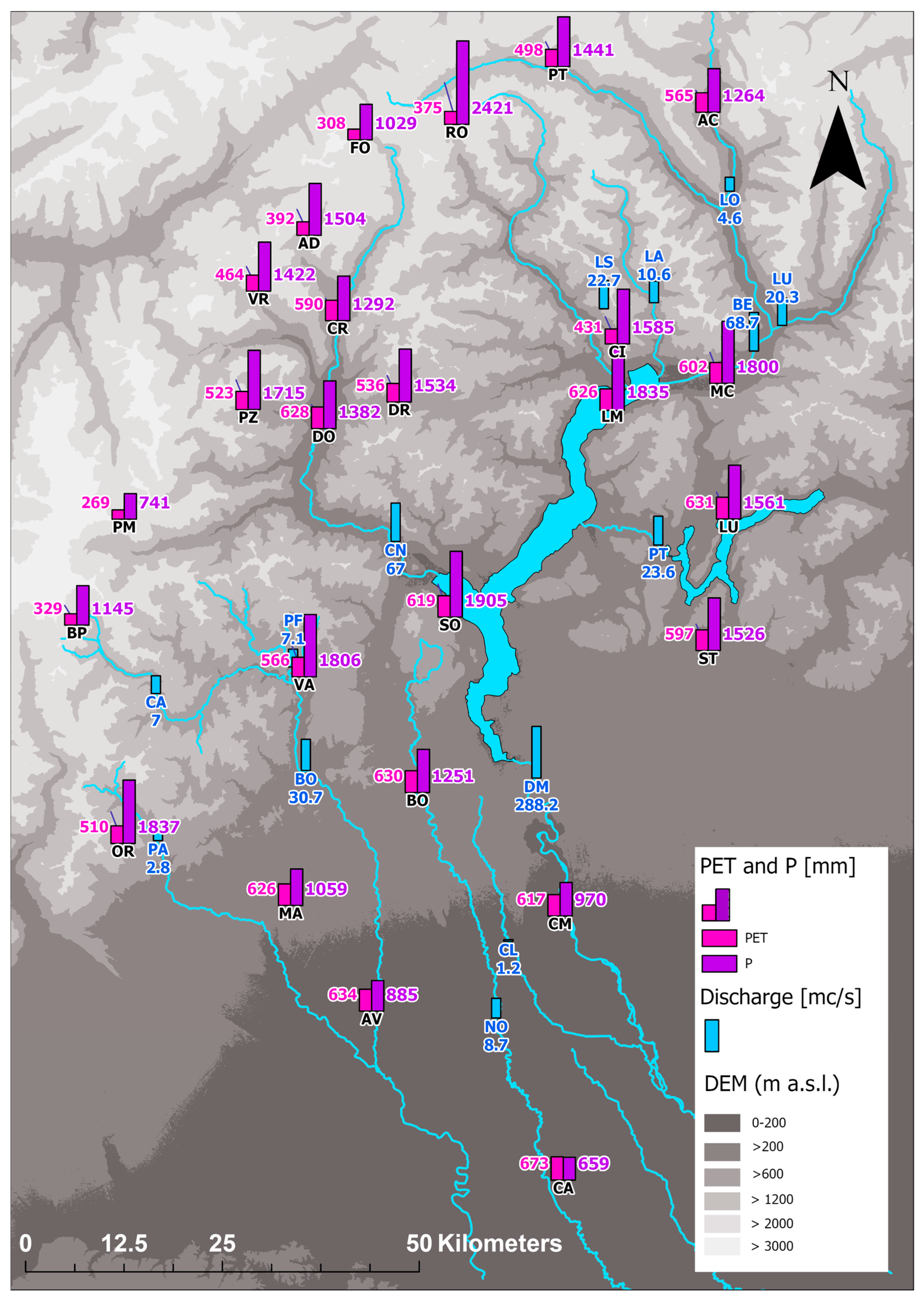 - Bocchiola, D. Long Term (1921–2011) Hydrological Regime of Alpine Catchments in Northern Italy. Adv. Water Resour. 2014, 70, 51–64. [Google Scholar] [CrossRef]