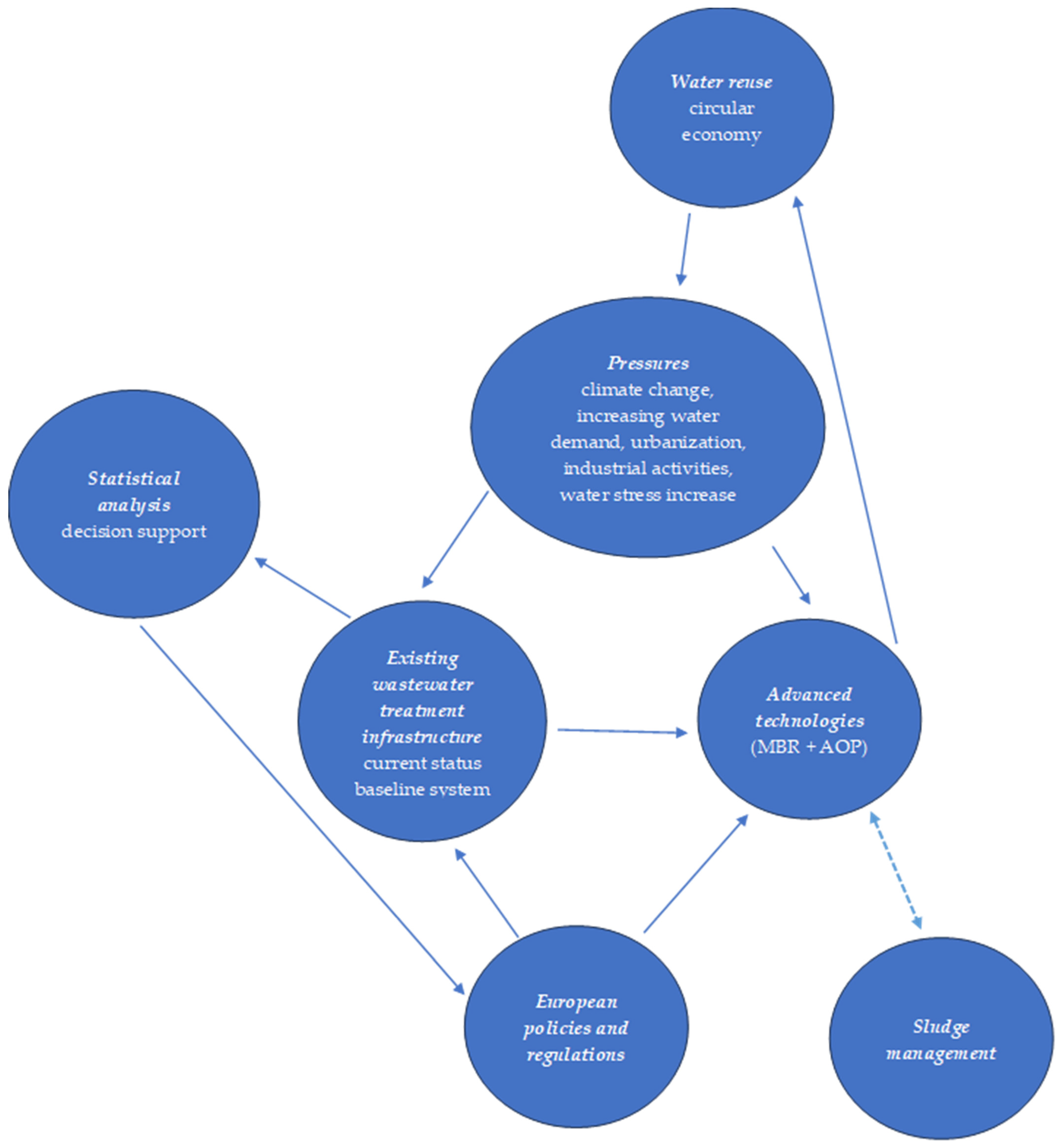 Figure 1 illustrates the integrated framework for advanced wastewater treatment in a European context. The diagram highlights the interactions among environmental and socio-economic pressures (climate change, increasing water demand, urbanization, and industrial activities), the current status of wastewater treatment infrastructure, and the implementation of advanced technologies (membrane bioreactors (MBRs) and advanced oxidation processes (AOPs). European policies and regulations influence both infrastructure development and technology adoption, while sludge management and water reuse pathways support the transition toward a circular water economy. Statistical analysis and decision-support tools provide feedback for system evaluation and optimization. Solid arrows indicate direct influences, dashed arrows represent feedback mechanisms, and dotted arrows denote indirect consequences within the system.