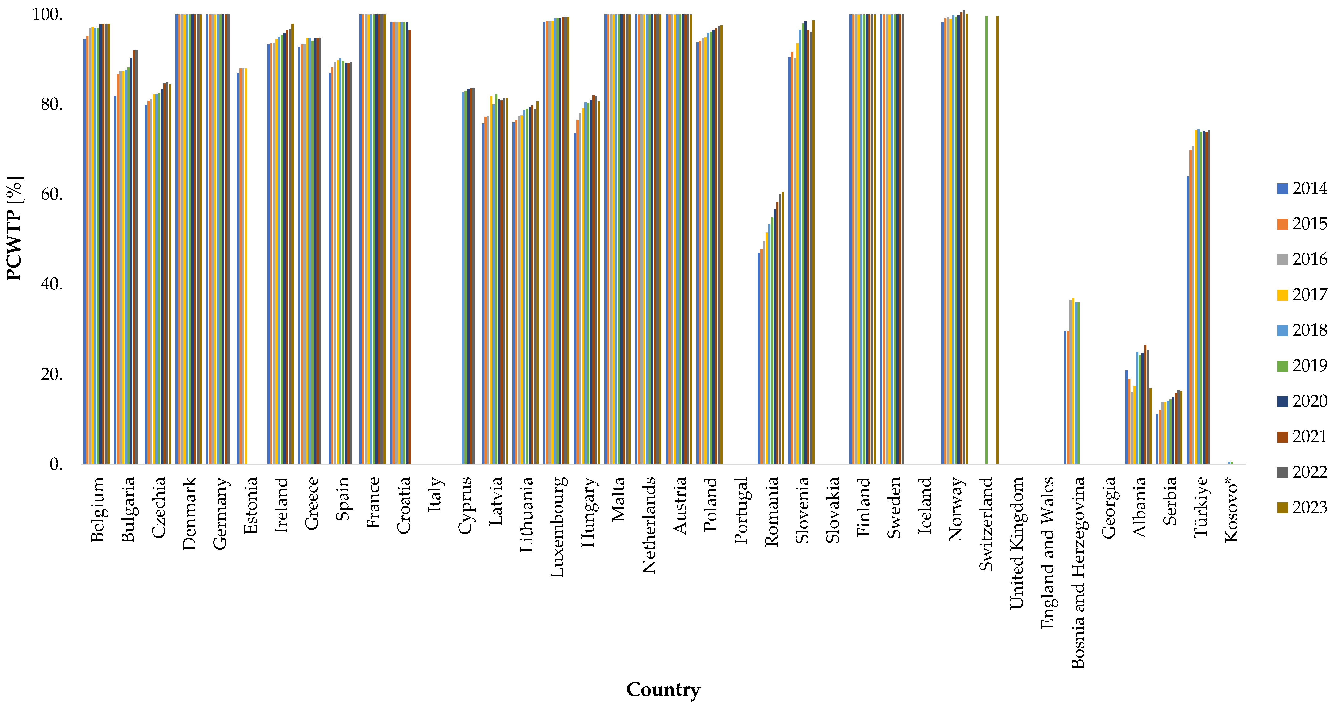Figure 2 shows divergent situations. When Denmark, Germany, France, Malta, the Netherlands, Austria, Finland, or Sweden is the country, the indicator has the maximum value. There are also situations in which data are unavailable for some of the years considered (Estonia, Croatia) or for the entire period (Italy, Portugal, Slovakia, etc.). Such absences may be due to reporting delays, national methodological differences, or uneven database updates. Missing data were removed from the analyses to ensure comparability of the series. Statistical analyses were performed only on the subset of countries with complete data for all indicators used. The lack of complete data for this indicator in some countries or years highlights the need to improve European-level statistical reporting systems. This limitation is congruent with similar observations in the literature on statistics on water and wastewater infrastructure.