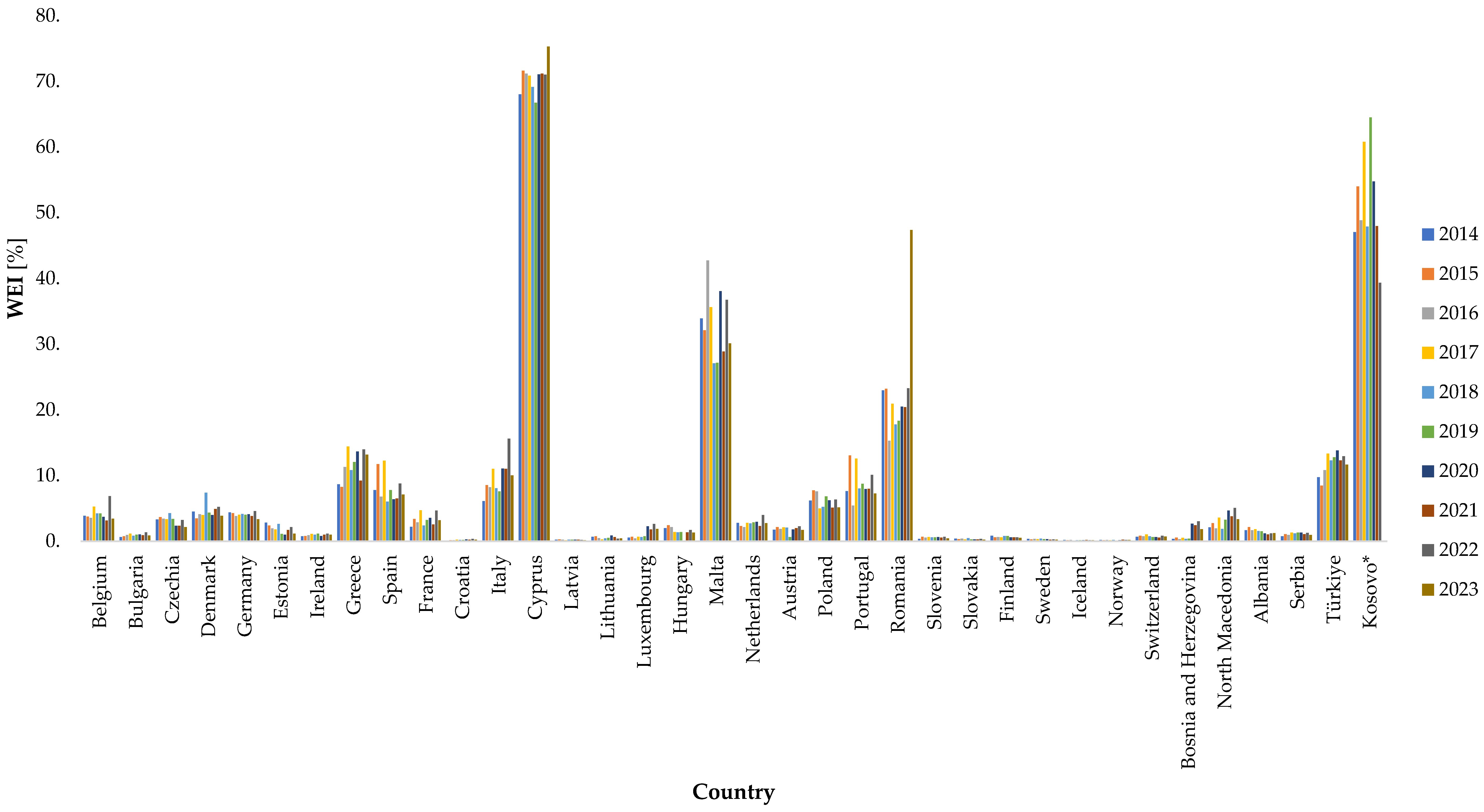 For this parameter, only one data point was missing. The analysis was based on the average value for each county. In view of this, countries such as Romania and Malta could be considered to be experiencing water scarcity, with values of 23.00% and 33.22%, respectively. Meanwhile, Cyprus and Kosovo could be classified as experiencing severe water scarcity, with WEI values of 70.62% and 51.69%, respectively, suggesting a severe level of water scarcity and increased pressure on available resources.