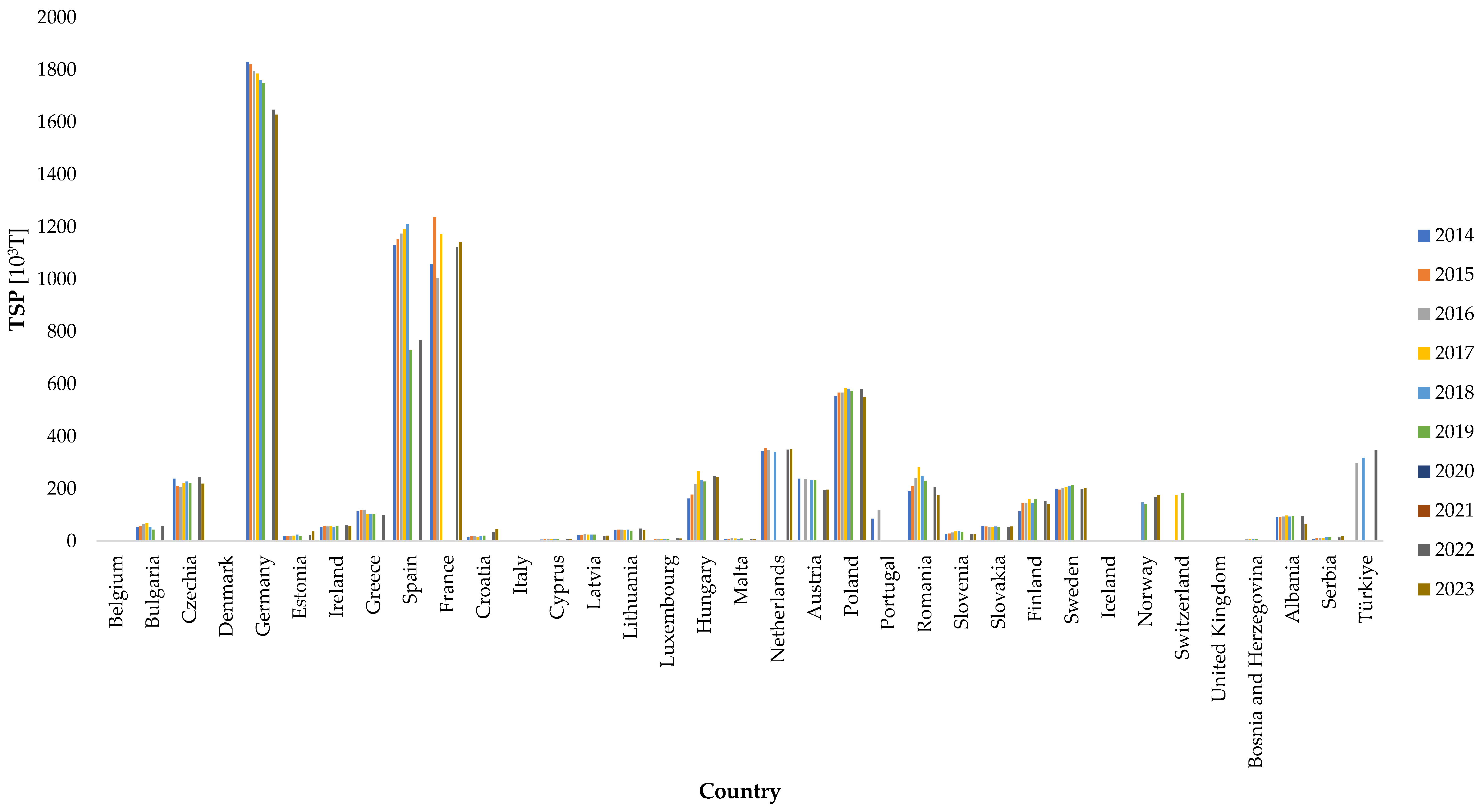 TSP presents the highest relative variability among the analyzed indicators, with values ranging from 6.77 × 103 T to 1744.17 × 103 T, an average of 213.68 × 103 T, and a standard deviation of 412.75∙103 T. This extremely high dispersion reflects major differences between countries in the size of treatment systems, the degree of population connectivity, and the volume of treated wastewater. From a PCA perspective, TSP has strong potential to influence the first principal components, as it is closely linked to operational pressure on treatment plants and to challenges in sludge management.