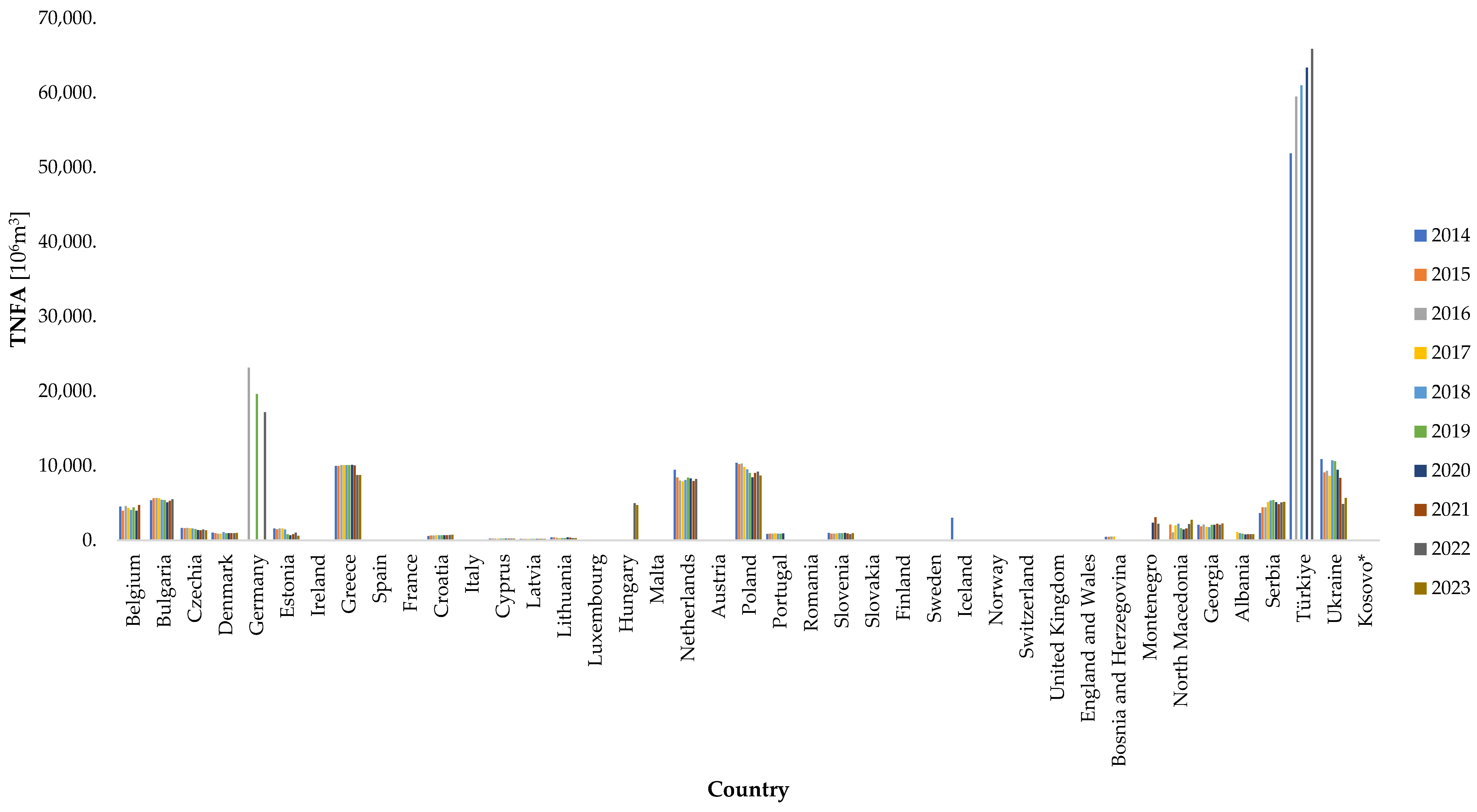 The total net freshwater abstraction (TNFA, [106 m3]) is an indicator of the long-term availability of water resources at the national level. Annual sludge production from wastewater treatment (TSP, [103 T]) is a relevant indicator for assessing the secondary impact of treatment processes and for analyzing the need for advanced sludge treatment and recovery technologies.