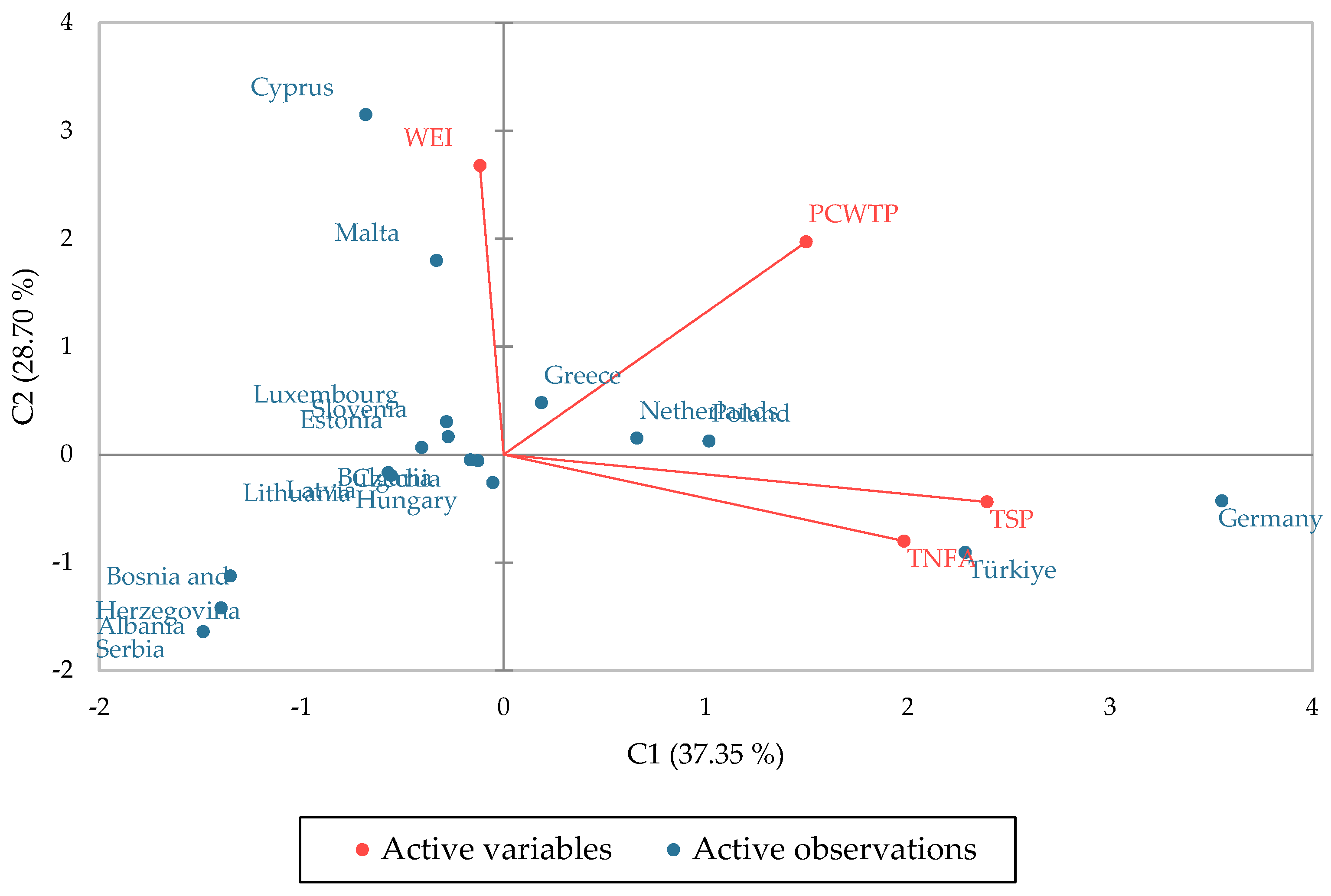 The distribution of observations’ contributions highlights key countries that define the PCA’s structure. For example, Germany could be considered a major determinant of the size of water use and treatment systems. Cyprus and Malta are among the most severely water-stressed countries. Turkey and the Western Balkan countries are transition regions, with mixed pressure and infrastructure profiles.