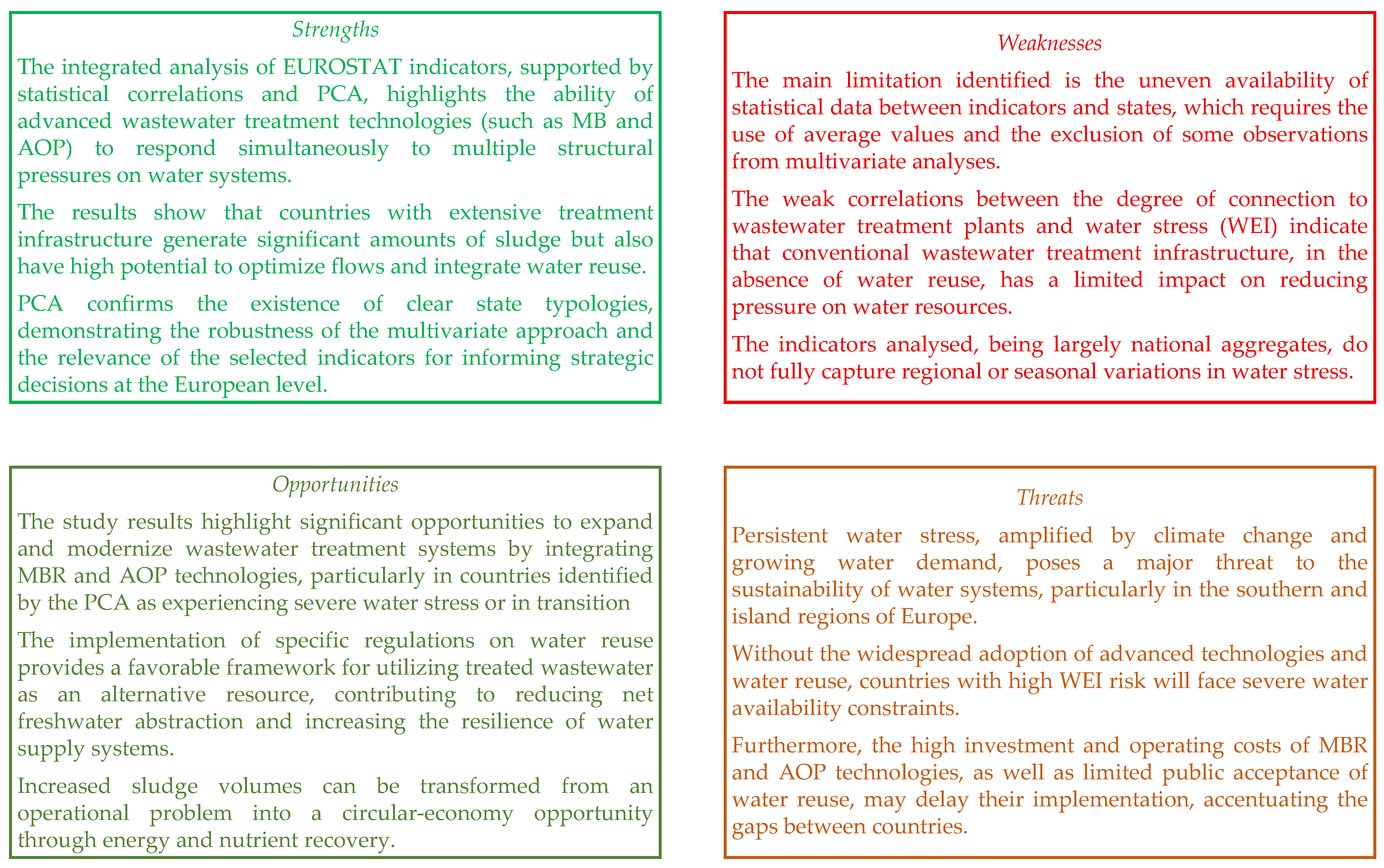 At the level of public policies and strategic planning, it is recommended to align investments in treatment infrastructure with indicators of water stress and pressure on water resources, such as the Water Exploitation Index. Statistical analysis at the European level suggests that States with limited freshwater resources should benefit from priority funding mechanisms to implement advanced technologies, especially in light of new requirements imposed by European legislation on effluent quality and water reuse.