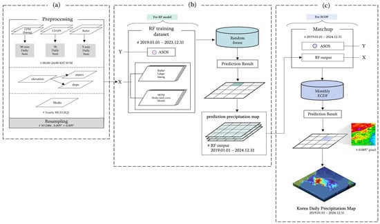 Workflow of the proposed RF-based QPE framework for South Korea: (a) preprocessing and resampling of data; (b) random-forest training with ASOS targets (2019–2023) (c) ECDF correction and production of the daily precipitation maps (2019–2024).