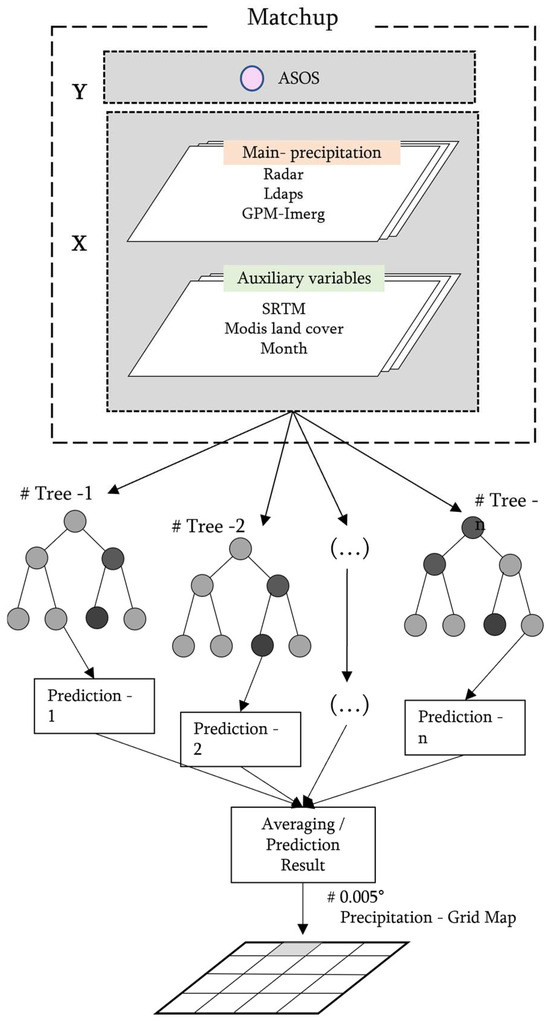 RF is particularly well-suited for multi-source precipitation fusion because it recursively partitions the predictor space to capture complex, nonlinear relationships among variables. Furthermore, it mitigates overfitting and local error amplification by aggregating the outputs of multiple decision trees [37,38,39]. Precipitation datasets from Radar, satellite, and NWP sources exhibit heterogeneous error structures and signal characteristics, making it challenging to achieve spatial consistency using a single data source. The ensemble structure of RF statistically integrates these diverse inputs to provide stable and robust estimates. As shown in Figure 3, the final RF estimate, , is computed as the average of the prediction outputs from individual decision trees, , as expressed in Equation (3). This ensemble-averaging mechanism effectively reduces predictive variance while preserving the necessary nonlinearity for accurate multisource QPE generation. The model was implemented using the Scikit-learn library in Python (Version 3.12), with key hyperparameters—such as the number and depth of trees—optimized via the Optuna library.
