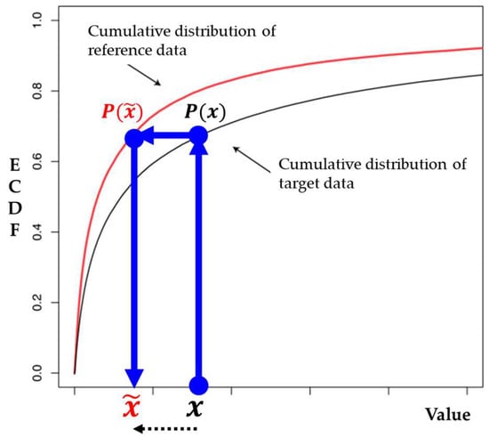 ECDF correction procedure using cumulative distribution of target data and reference data.