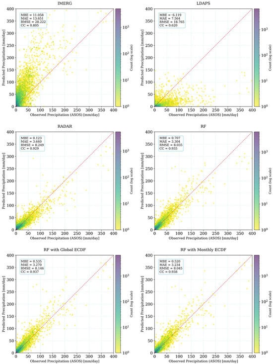 While the LOYO framework provides an independent evaluation for 2024, it cannot fully characterize interannual variability or historically rare extreme events. To explicitly assess performance under extreme rainfall conditions, we evaluated high-percentile days using the full matchup dataset (2019–2024). For ASOS-observed daily precipitation exceeding the 95th percentile (≥49.0 mm day−1; n = 3944), the RF with Monthly ECDF achieved an MBE of −2.48 mm day−1, an MAE of 11.58 mm day−1, an RMSE of 18.80 mm day−1, and a CC of 0.905 (see also Section 4.3 for event-based analyses).