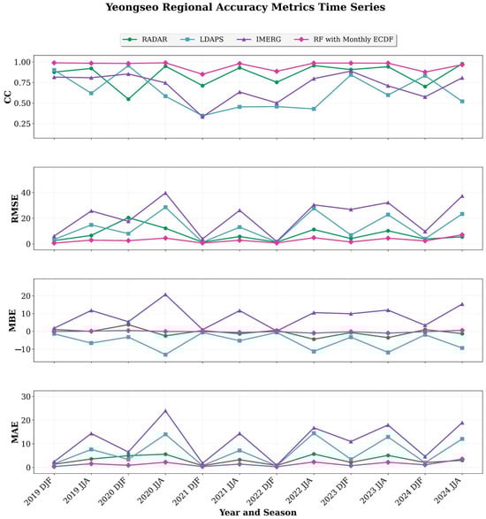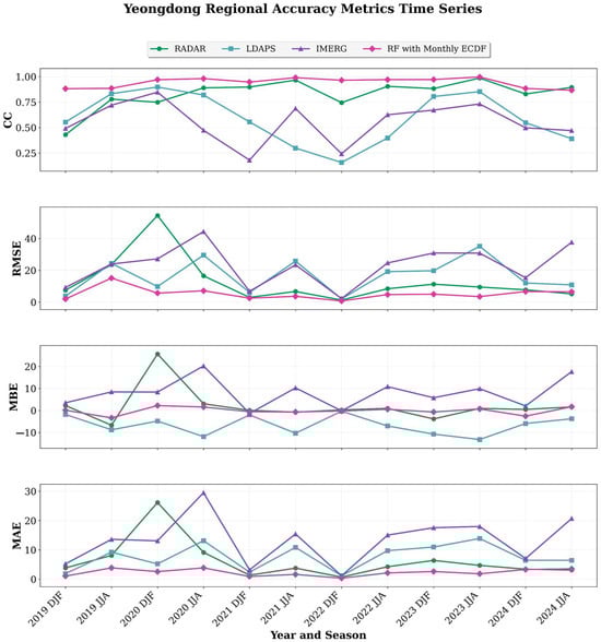 Station−wise accuracy metrics (MBE, MAE, RMSE, and CC) for 12 ASOS sites in the Yeongdong and Yeongseo regions (2019–2024). The results compare four precipitation products (Radar, LDAPS, IMERG, and the RF with Monthly ECDF) during the winter (DJF) and summer (JJA). The Yeongdong stations include STN 90, 104, 105, and 106, while the Yeongseo stations include STN 93, 95, 101, 114, 121, 211, 212, and 217. Each panel displays seasonal time series, confirming that the regional performance patterns reported in Section 4.2 are consistently reproduced across individual stations.
