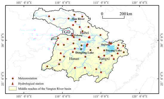 The river network in the middle reaches of the Yangtze River, as well as the locations of meteorological and hydrological stations.