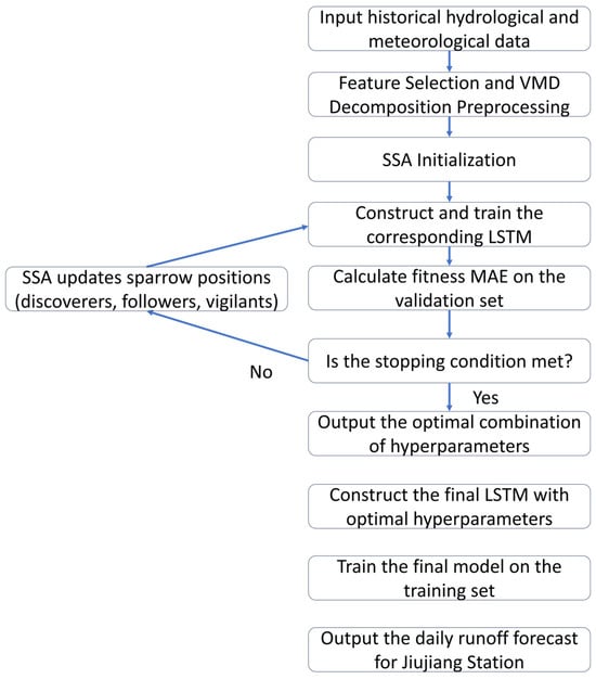 Therefore, this study focused on daily runoff forecasting at Jiujiang Station in the middle Yangtze River, a site subject to complex river–lake backwater effects and anthropogenic disturbances. To address this challenge, we constructed and validated a forecasting framework. We employed the SSA to adaptively determine the parameters for Variational Mode Decomposition (VMD) preprocessing, and to automatically optimize the hyperparameters of the LSTM model. This SSA-VMD-LSTM framework is designed to enhance the model’s adaptability to the complex hydrological dynamics at Jiujiang Station, leading to more accurate and robust runoff predictions.