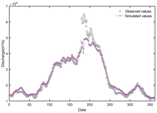 The predicted flow of Jiujiang Station showed a good fit with the observed flow (Figure 4). During the training period of the SSA-LSTM model, the RMSE at Jiujiang Station was 709.04 m3/s, the MAE was 494.74 m3/s, and the NSE reached 0.99. During the validation period of the SSA-LSTM model, the RMSE at Jiujiang Station was 600.13 m3/s, the MAE was 453.97 m3/s, and the NSE reached 0.99. During the testing period, the RMSE at Jiujiang Station was 1729.33 m3/s, the MAE was 926.72 m3/s, and the NSE reached 0.98.