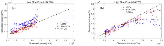 Comparison of prediction performance between LSTM and SSA-LSTM models at different flow levels. (a) Comparison of predictive performance at low-flow zone (≤14,600 m3/s); (b) comparison of predictive performance at high-flow zone (>35,225 m3/s).