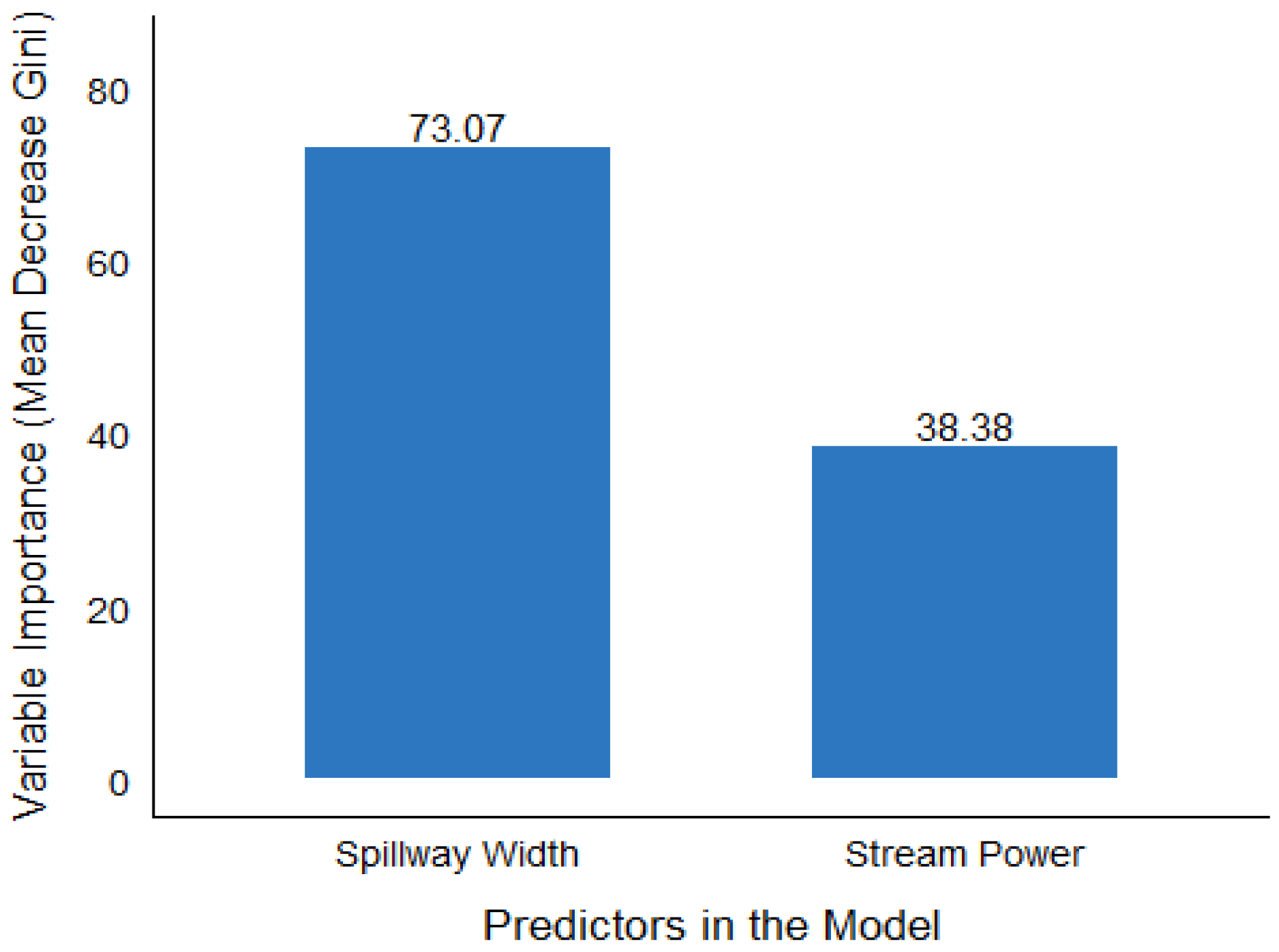 24]. Each tree is trained on a random subset of data and predictor variables, and the final classification is determined by majority voting across trees. This nonparametric method is particularly advantageous for erosion modeling because it can capture complex, nonlinear, and interacting effects between spillway width and stream power without assuming a specific functional form. Variable importance was computed based on the Mean Decrease in Gini impurity, which quantifies each predictor’s contribution to reducing model uncertainty.