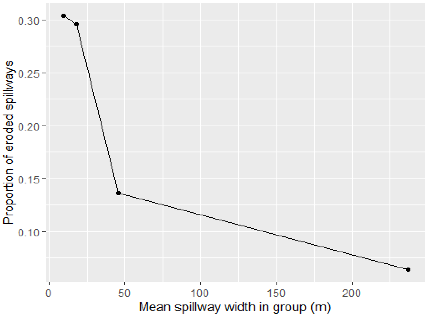 A descriptive analysis of observed erosion rates further validates the model results. When spillways were grouped into quartiles based on width, erosion rates decreased systematically from 30.4% in the smallest (narrowest spillway width) quartile to 6.4% in the largest (widest spillway width) quartile, as shown in