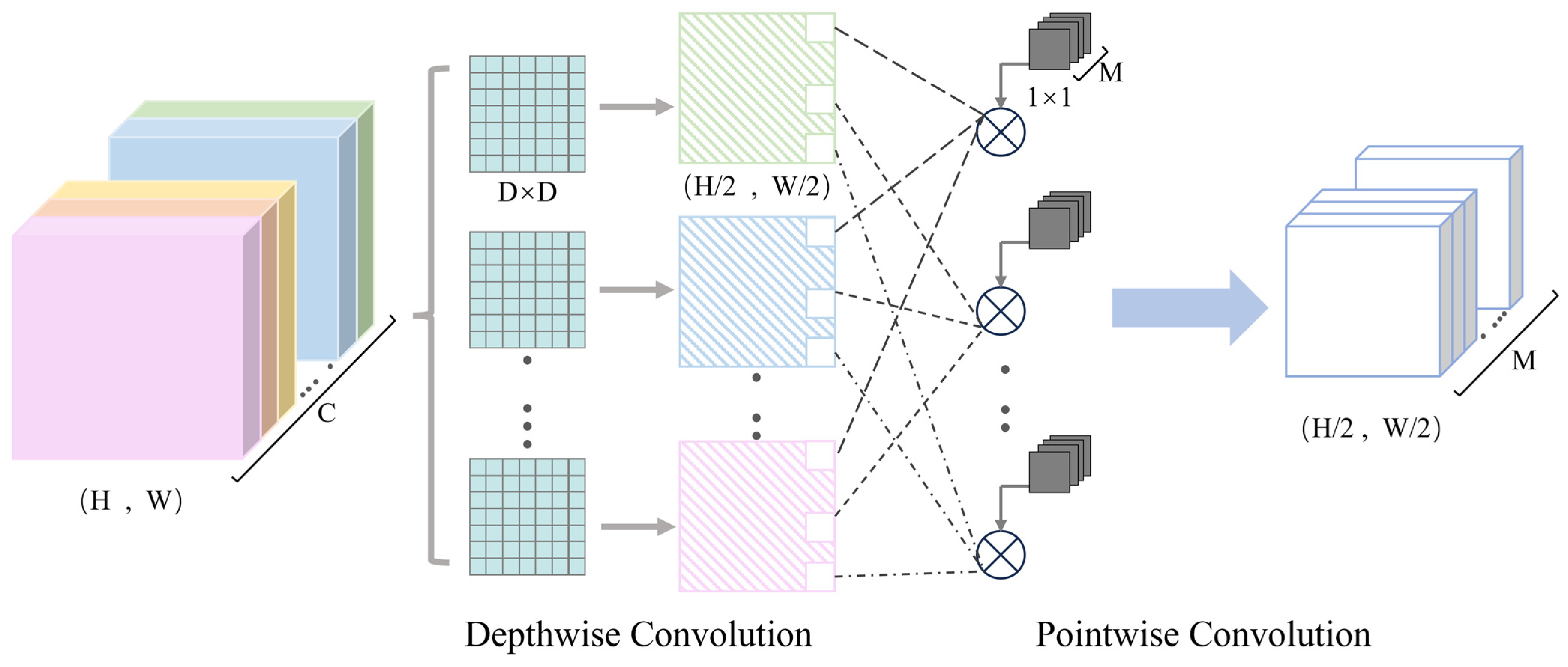 36]. To address these challenges, lightweight convolutional architectures have emerged as a promising alternative. Depthwise separable convolution, originally developed to reduce computational complexity in computer vision tasks, decomposes standard convolution into channel-wise spatial filtering and pointwise feature fusion, leading to a significant reduction in parameter count and floating-point operations without altering the representational capacity of the network [