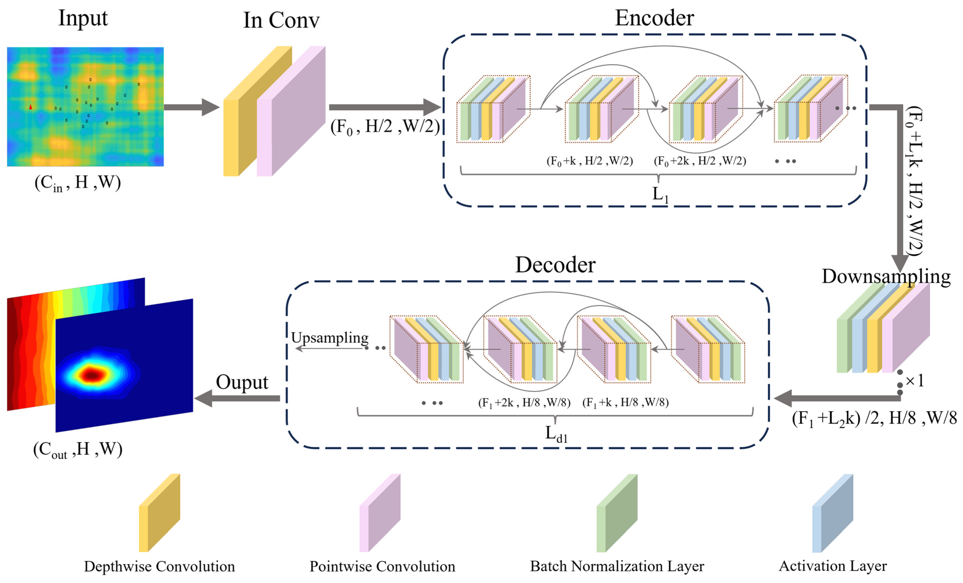 37]. When combined with dense connectivity and encoder–decoder structures, depthwise convolution enables the efficient extraction and reuse of multiscale spatial features, making it well suited for surrogate modeling of groundwater flow and contaminant transport processes characterized by spatial heterogeneity.