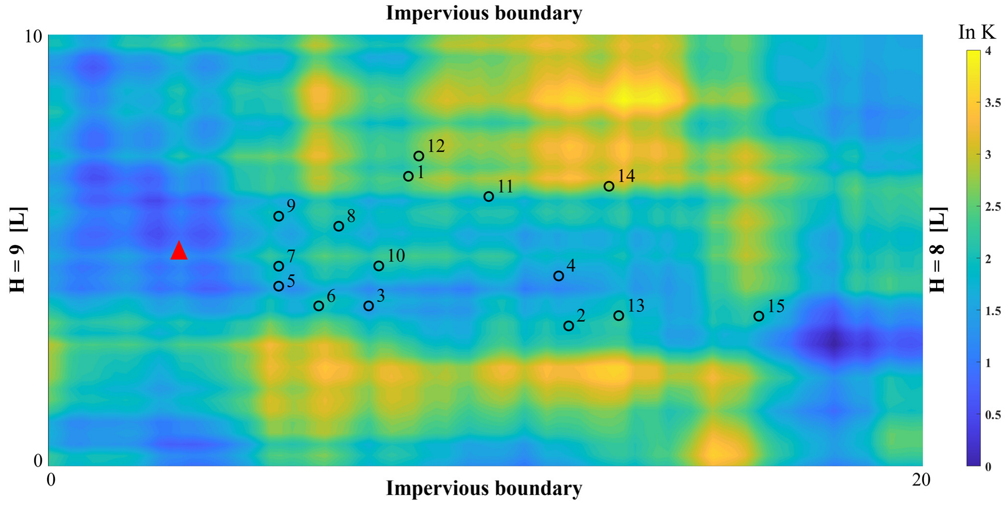 Figure 10, the physics-based ILUES-LM successfully reconstructs the main patterns of the reference field. The mean estimate clearly shows the continuous high-conductivity zones (yellow-orange areas) and surrounding low-conductivity regions (blue areas). The randomly selected posterior realization preserves the spatial connectivity and variability of these zones. The variance field is generally low across most of the domain, with slightly higher values in a few isolated points, reflecting limited influence from distant observations.