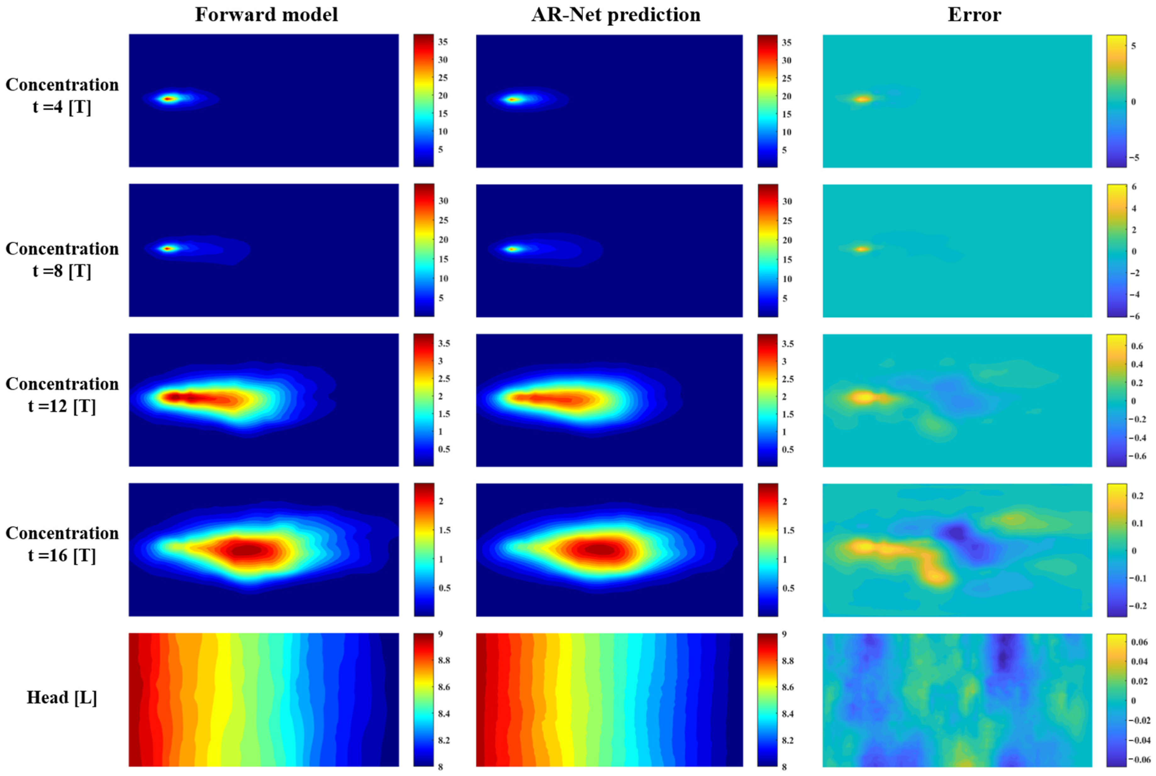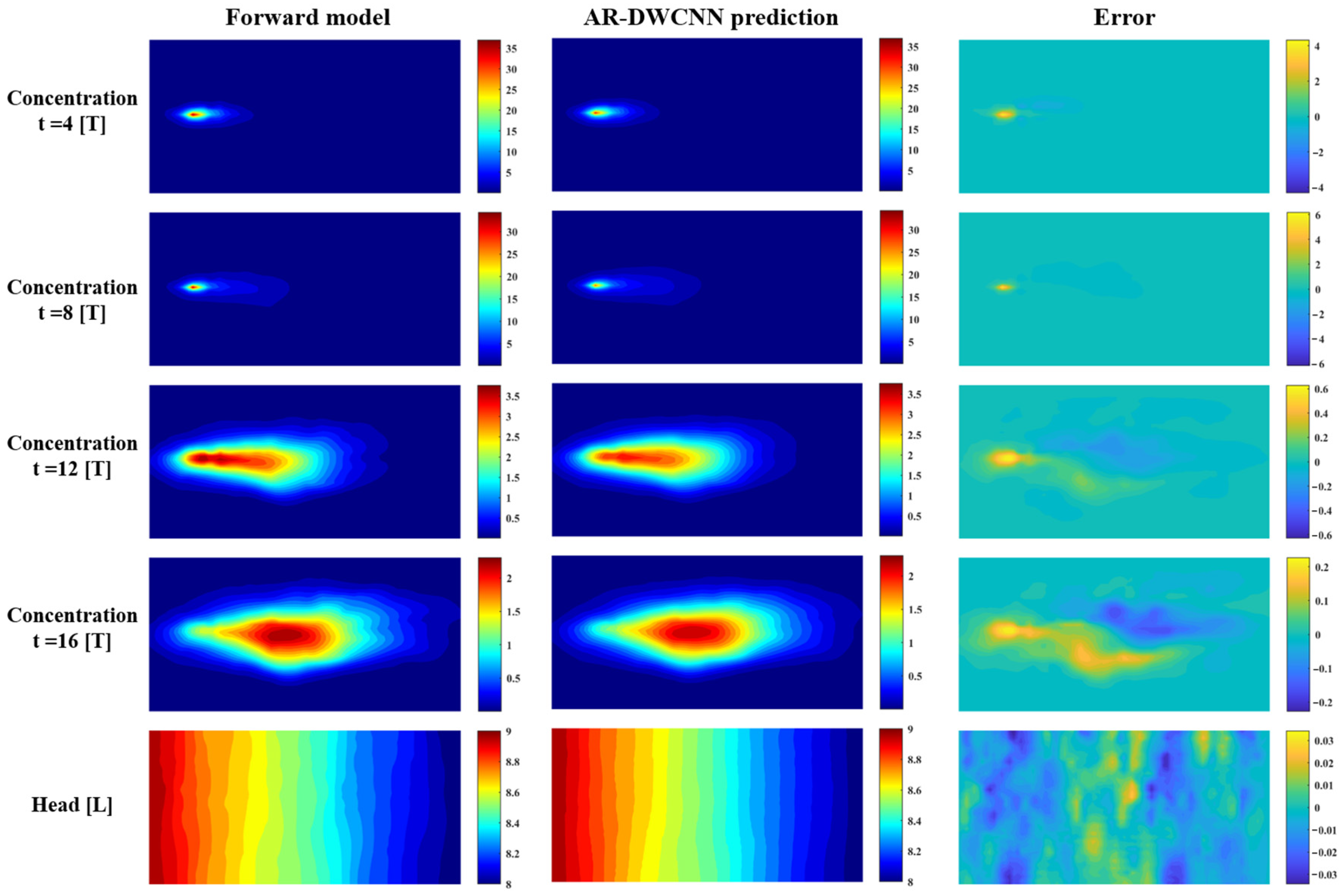 30]. The visual and quantitative agreement validates the capability of AR-DWCNN to capture the full-field groundwater flow and contaminant transport process, providing a reliable and computationally lightweight alternative to validated architecture like AR-Net.