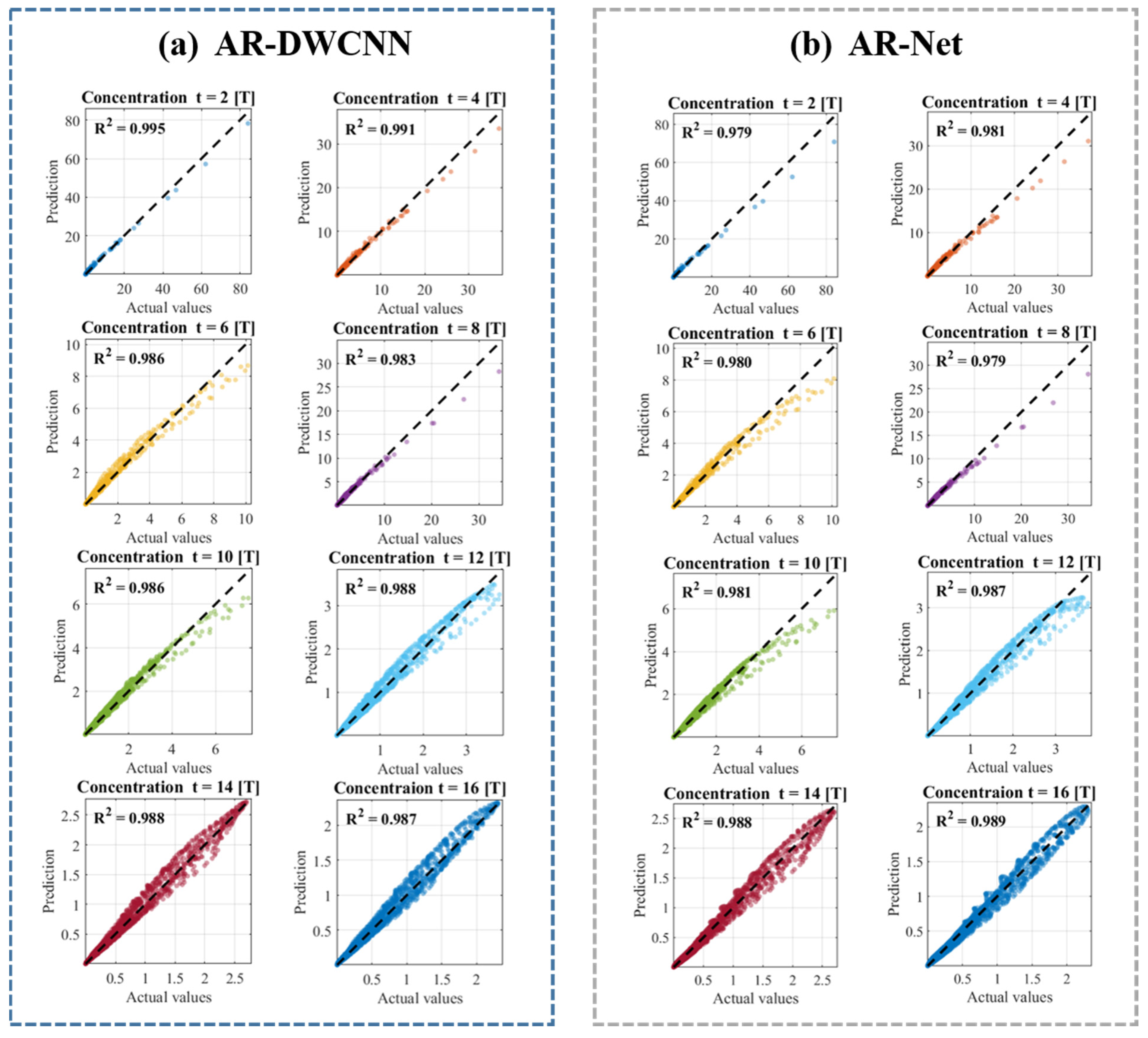 2 = 0.984 and RMSE = 0.067 obtained by AR-Net for concentration fields at the final time step (t = 16 [T]). Additionally, AR-DWCNN exhibits a smaller mean bias error (MBE = 0.017 vs. 0.021), reduced uncertainty (U95 = 0.280 vs. 0.332), and a lower global performance indicator (GPI = 5.004 × 10