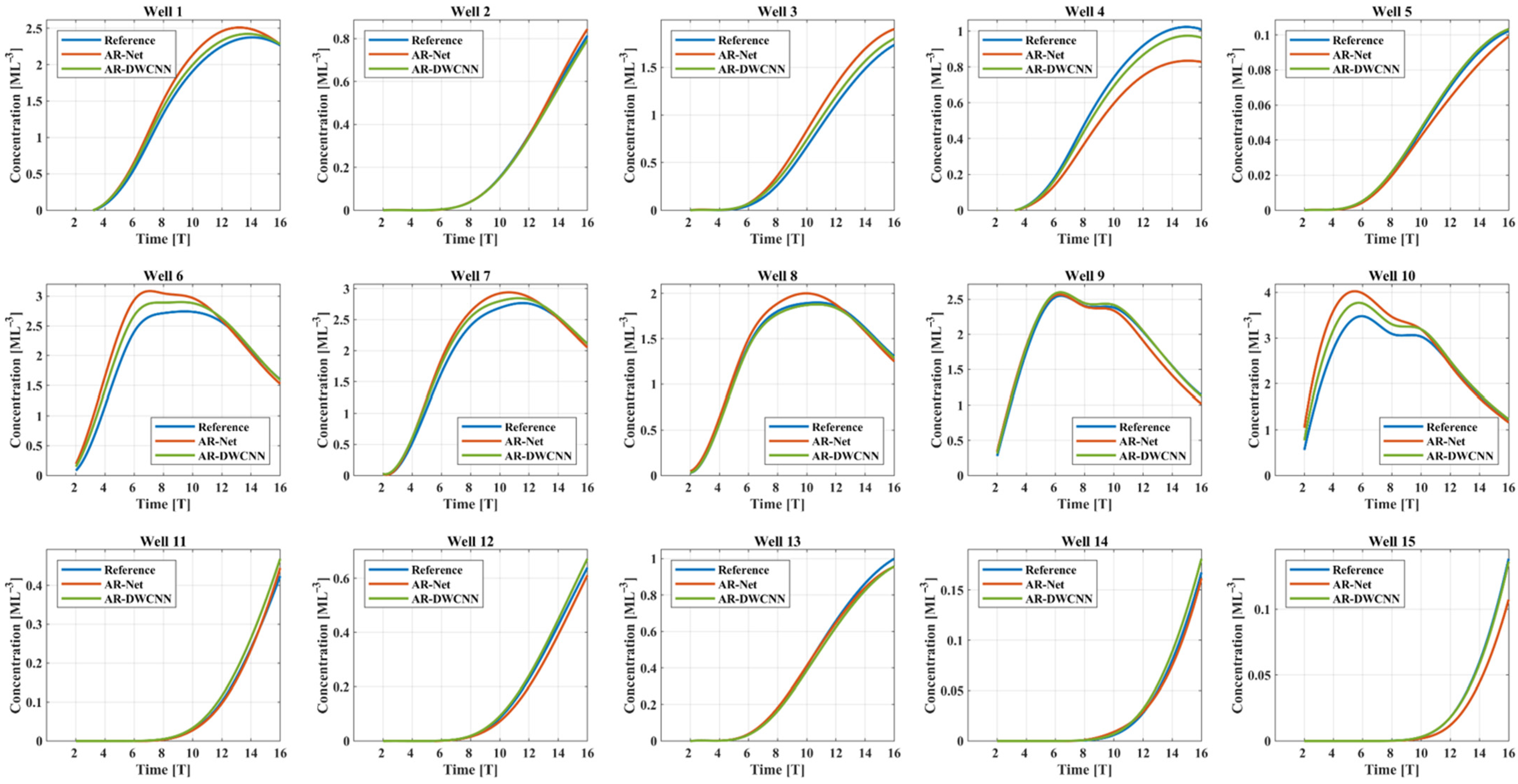 Figure 6. Due to the finite-duration release of the contaminant source (stops after t ≥ 8T), observation wells closer to the source or on the main flow path (e.g., wells 6–9) exhibit complete “rise–peak–decline” features within the simulation time, while more distant or transversely influenced wells (e.g., wells 2–5 and 11–15) remain in the concentration rising phase during the 0–16 T period and have not yet reached their peak, thus not displaying complete breakthrough curve morphology. Both surrogates reproduce general trends effectively, including peak arrival times, maximum concentrations, and tailing behavior at most wells. This agreement confirms that both models provide reliable concentration data at observation points, which is important for driving accurate inversion in data assimilation. AR-DWCNN generally tracks the reference curves more closely than AR-Net, particularly during rapid rise and peak phases. For instance, at upstream wells (e.g., Wells 5, 7, 9) influenced by source proximity, AR-DWCNN better matches the peak timings and magnitudes, while AR-Net shows slight delays or overestimations in some cases. Downstream wells (e.g., Wells 11, 13, 14) exhibit smoother lower-amplitude responses due to dispersion; here, both surrogates perform well, though AR-DWCNN exhibits marginally less deviation in tailing sections. Across the testing set, the mean RMSE of breakthrough curves for AR-DSCNN is 0.019, compared to 0.032 for AR-Net, confirming substantially higher prediction accuracy at observations despite the lightweight architecture.