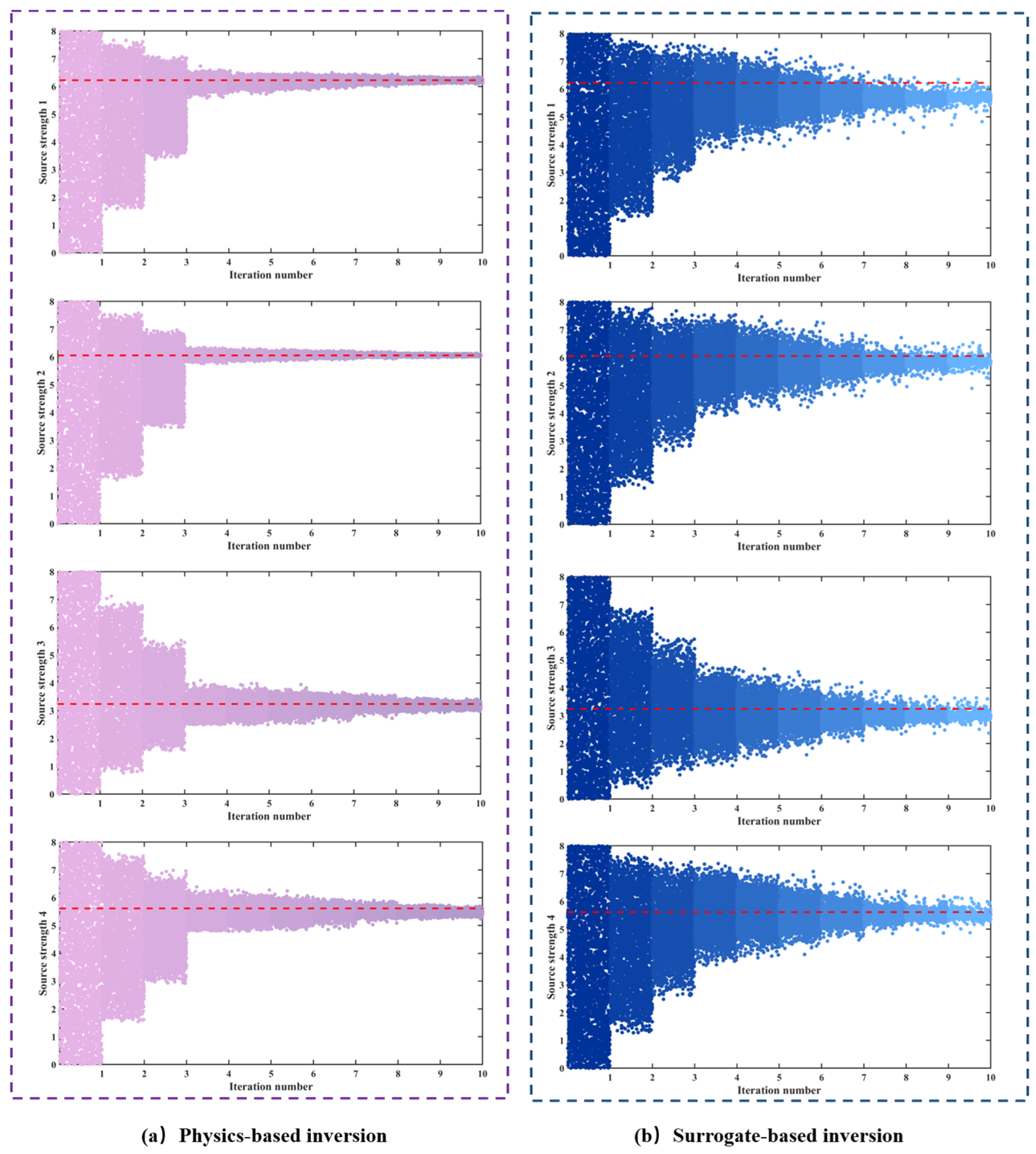 Figure 9 illustrates the inversion results for the 4 contaminant source strength parameters with the increase in iteration for physics-based ILUES-LM (left column) and surrogate-based ILUES-LM (right column). In both cases, the ensemble means move toward the true values within the early iterations, accompanied by a progressive reduction in ensemble spread. Compared to the physics-based implementation, the surrogate-based ILUES-LM exhibits a slightly slower convergence rate; nevertheless, it continues to evolve steadily and ultimately converges to values close to the reference. Therefore, the surrogate-based approach demonstrates convergence behavior that is qualitatively consistent with the physics-based inversion, confirming its capability to accurately identify source strengths.