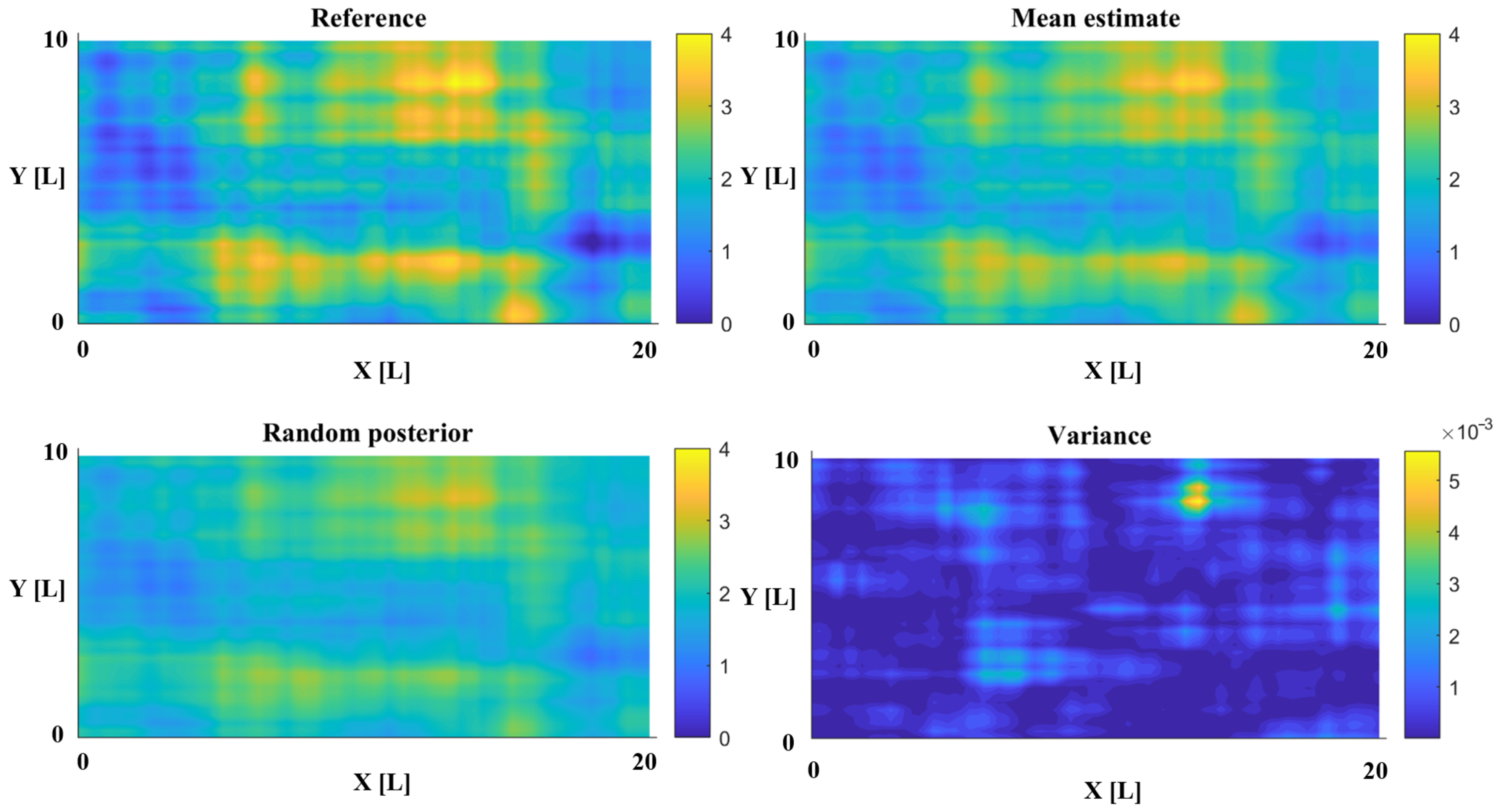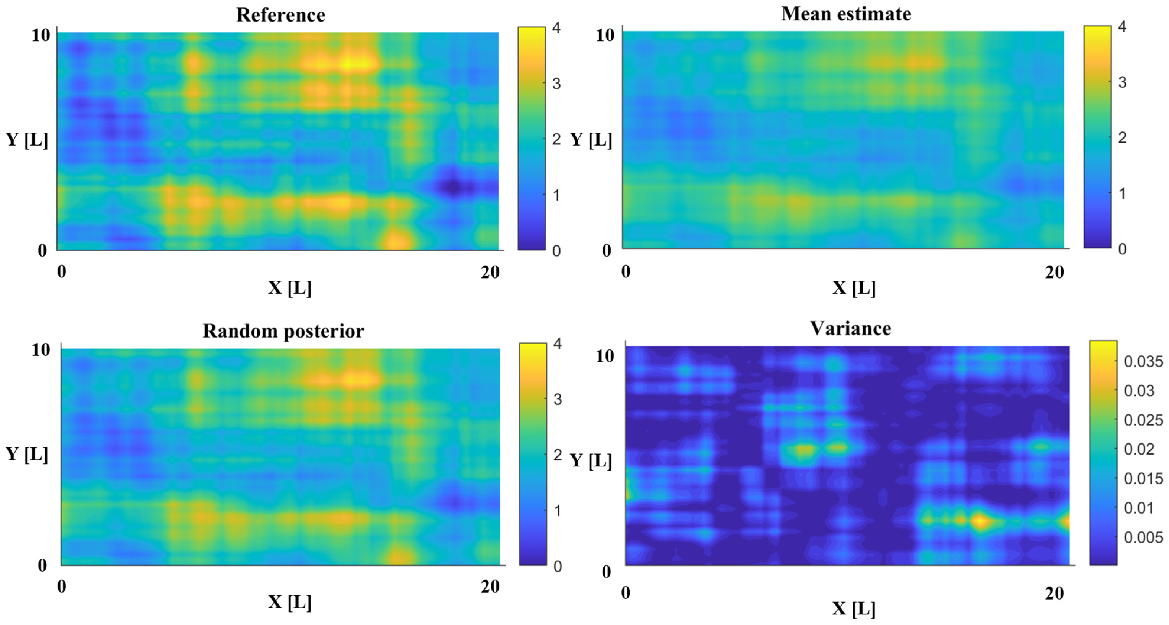 Figure 11). The mean estimate captures the overall structure of high- and low-conductivity zones, with only minor underestimation. The selected posterior realization exhibits comparable heterogeneity and continuity to the physics-based case. The variance field is marginally higher, which can be attributed to residual discrepancies between the selected observations and the true values, leading to a systematic bias in the ensemble inversion and, consequently, elevated uncertainty levels. Another reason might be the inherent characteristics of sparse observations relative to the high-dimensional parameter space, which amplifies the impact of these surrogate errors on uncertainty propagation.