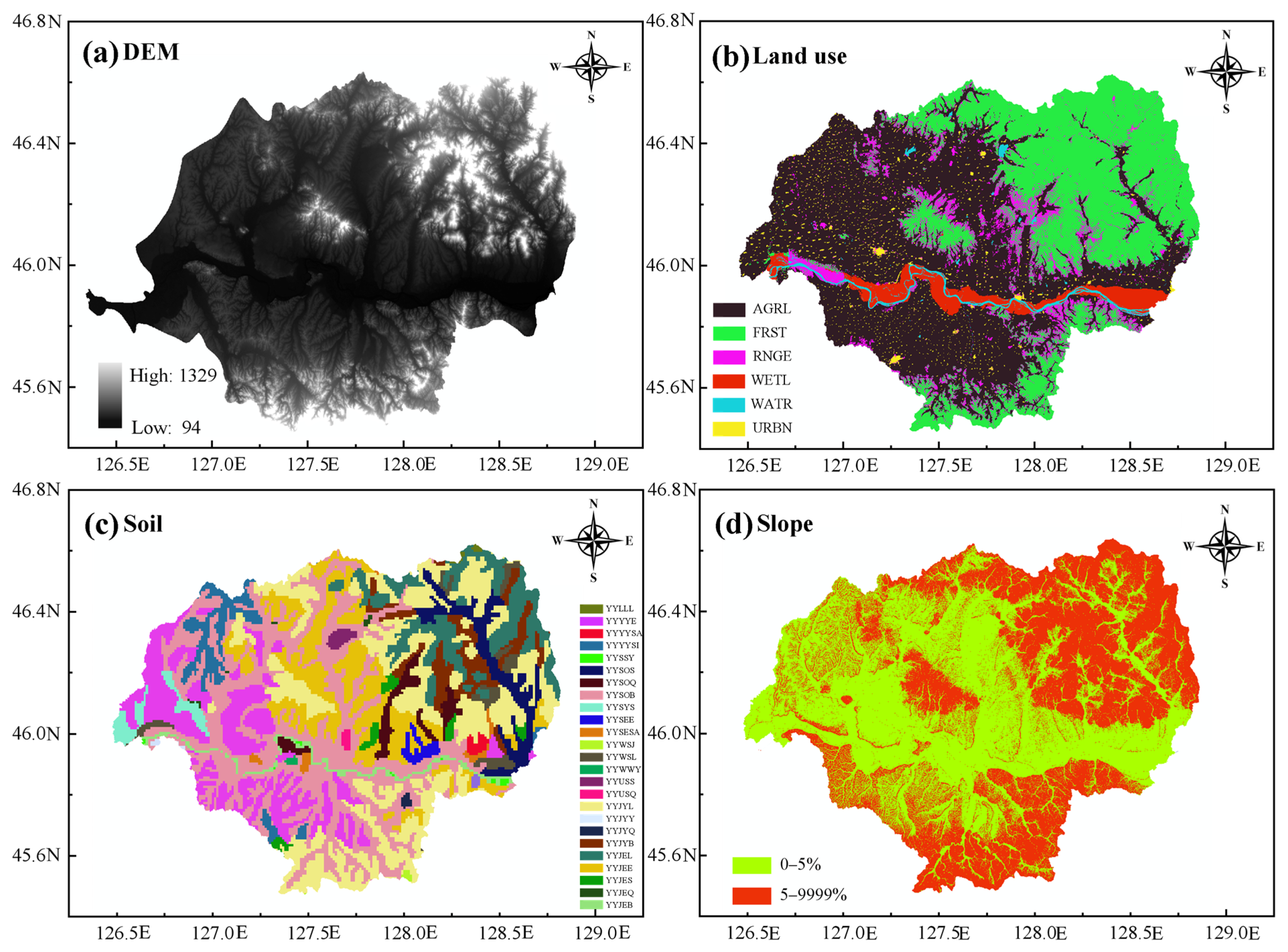 - Agricultural management measures: We reviewed historical data from the region over the past few years and actively sought opinions from relevant experts in the field and local farmers to extract the main types of crops and corresponding fertilization measures in the Heilongjiang region. Relevant collected data were incorporated into the model to calibrate it, improving its ability to simulate real-world scenarios (Table 2).