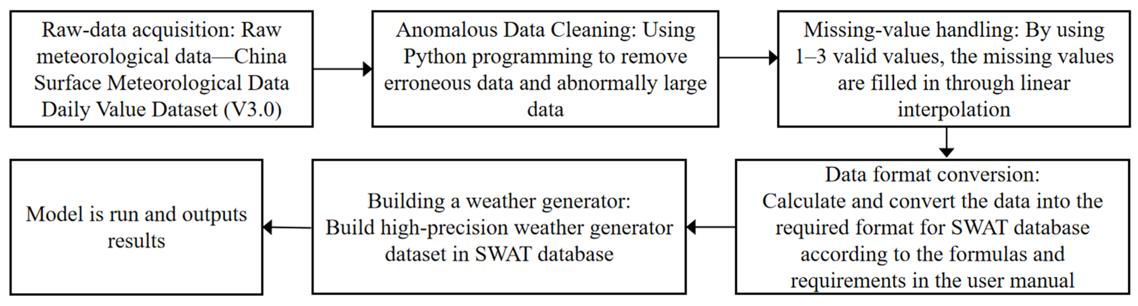 - Weather generator database: SWAT has an embedded WXGEN weather generator [37] that can generate meteorological data or supplement missing data, which can meet the simulation requirements for most areas in the United States. Currently, most scholars use the CFSR_World weather generator to create simulated meteorological data. It is based on the Climate Forecast System Reanalysis (CFSR) global meteorological dataset, which is a high-resolution meteorological reanalysis dataset provided by the National Oceanic and Atmospheric Administration (NOAA) of the United States. If constructing other weather generators, various calculation formulas must be used based on the observation data of meteorological stations to generate multi-year monthly average characteristics of various meteorological parameters. In this study, the China Surface Climate Daily Dataset, Version 3.0 (1951–2020), was used to construct a weather generator (WGEN_HLJ) suitable for the Heilongjiang region of China. The specific technical roadmap is shown in Figure 3.