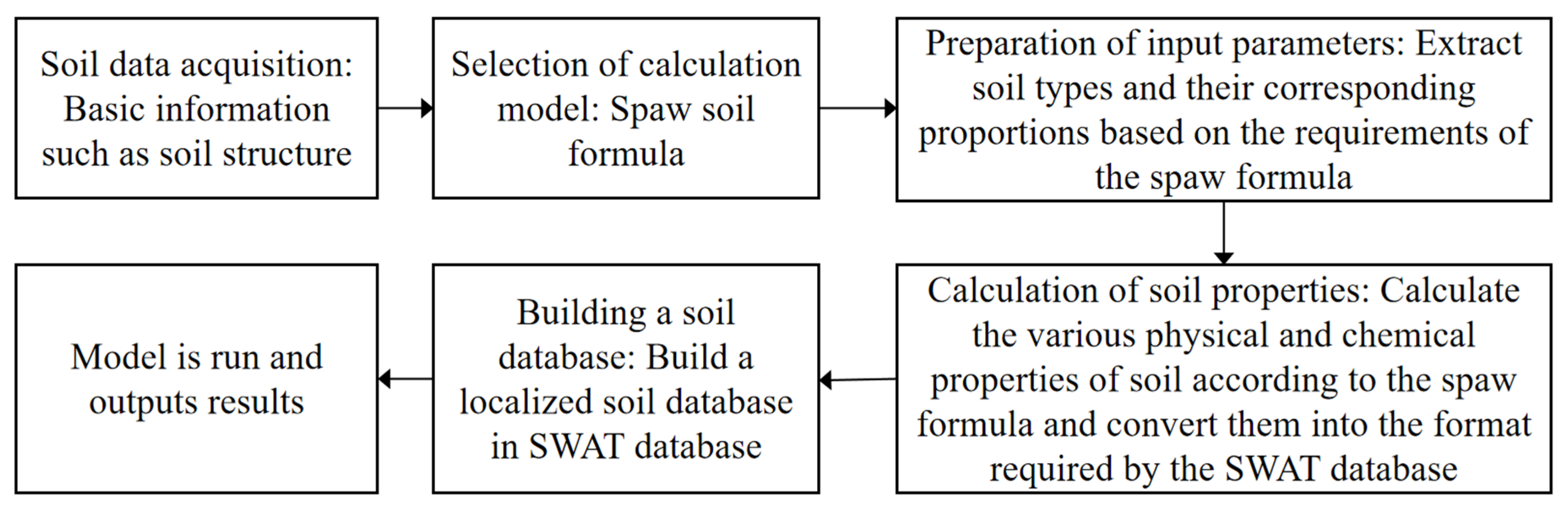 - Soil database: In calculating parameters such as soil available water capacity and saturated hydraulic conductivity, we utilized the SPAW soil characteristic calculation formula [38]. This formula, based on extensive soil science theory and abundant experimental data, can accurately calculate various soil properties and substance contents based on different soil types and environmental conditions. In this study, we used this formula to construct the soil attribute database SOIL_HLJ suitable for the Heilongjiang region of China. The specific technical roadmap for constructing the database is shown in Figure 4.