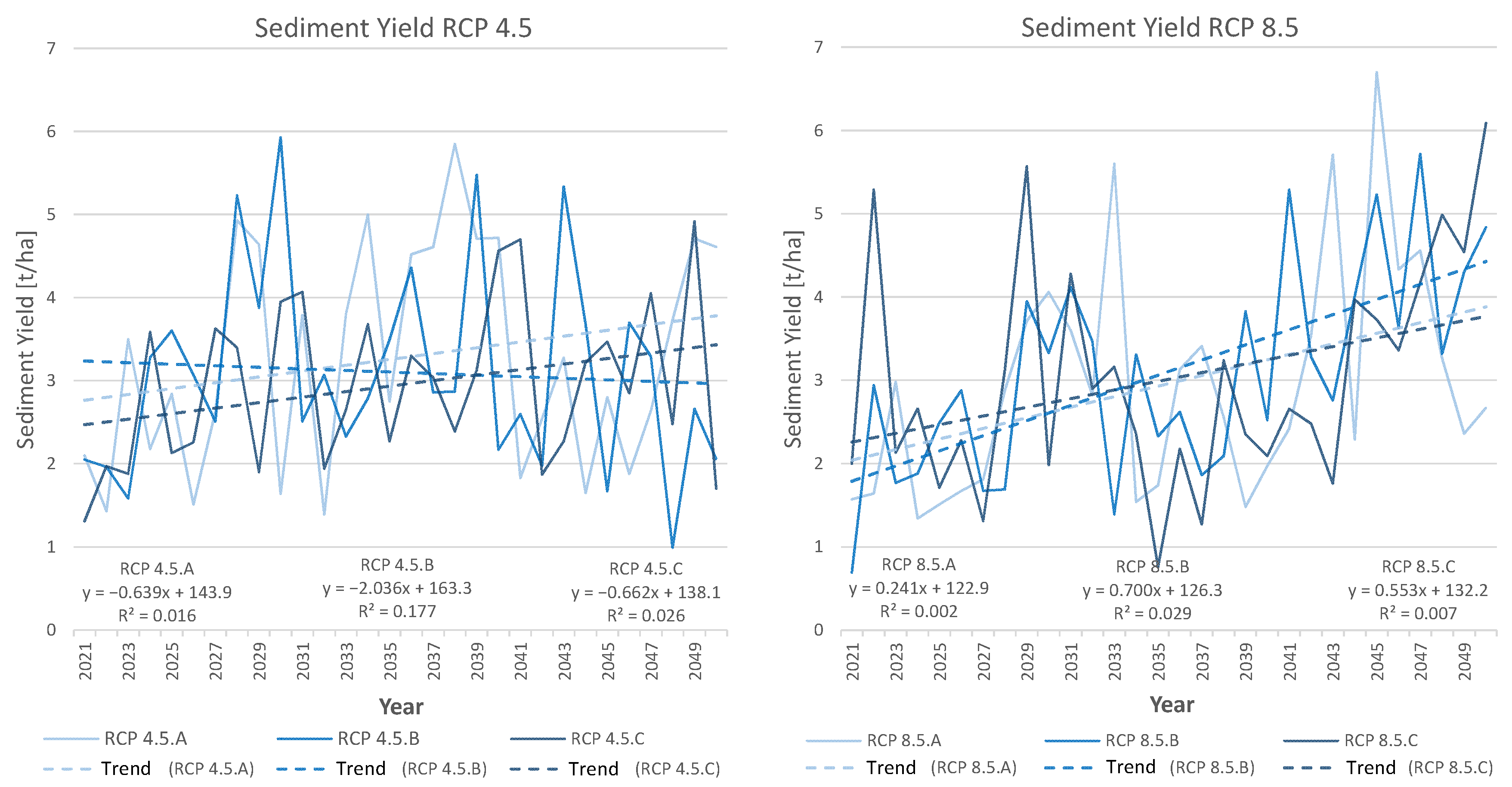 - This intensification is followed by a stabilization phase in the final decade (2041–2050). The average annual SYLD values across the RCM ensemble in 2041–2050 (ranging from 2.79 to 3.16 t ha−1 yr−1) generally return to levels comparable to or slightly above those of the initial decade (2021–2030). For instance, realization A stabilizes to 2.96 t ha−1 yr−1 by the final decade, a +62% increase over the baseline.