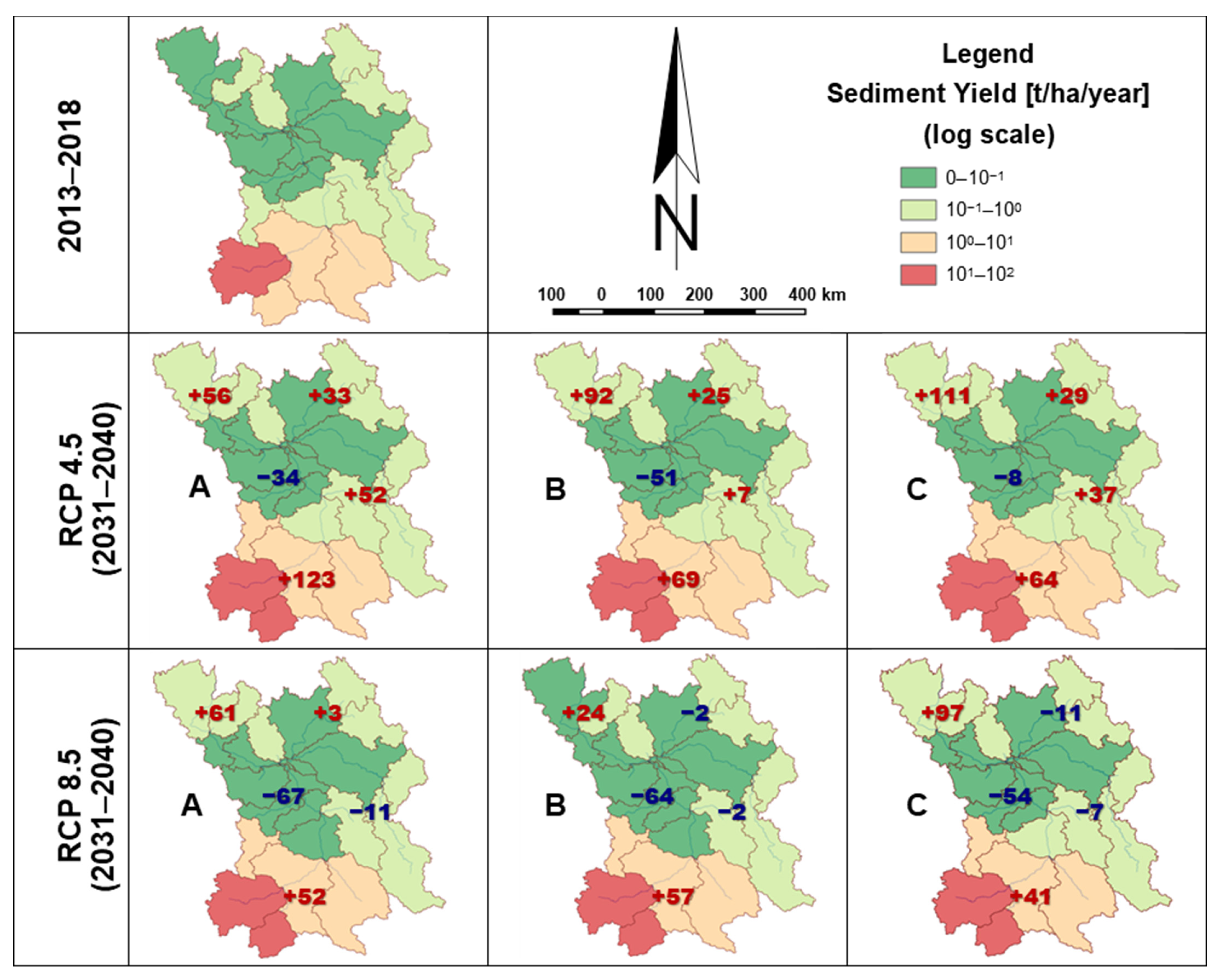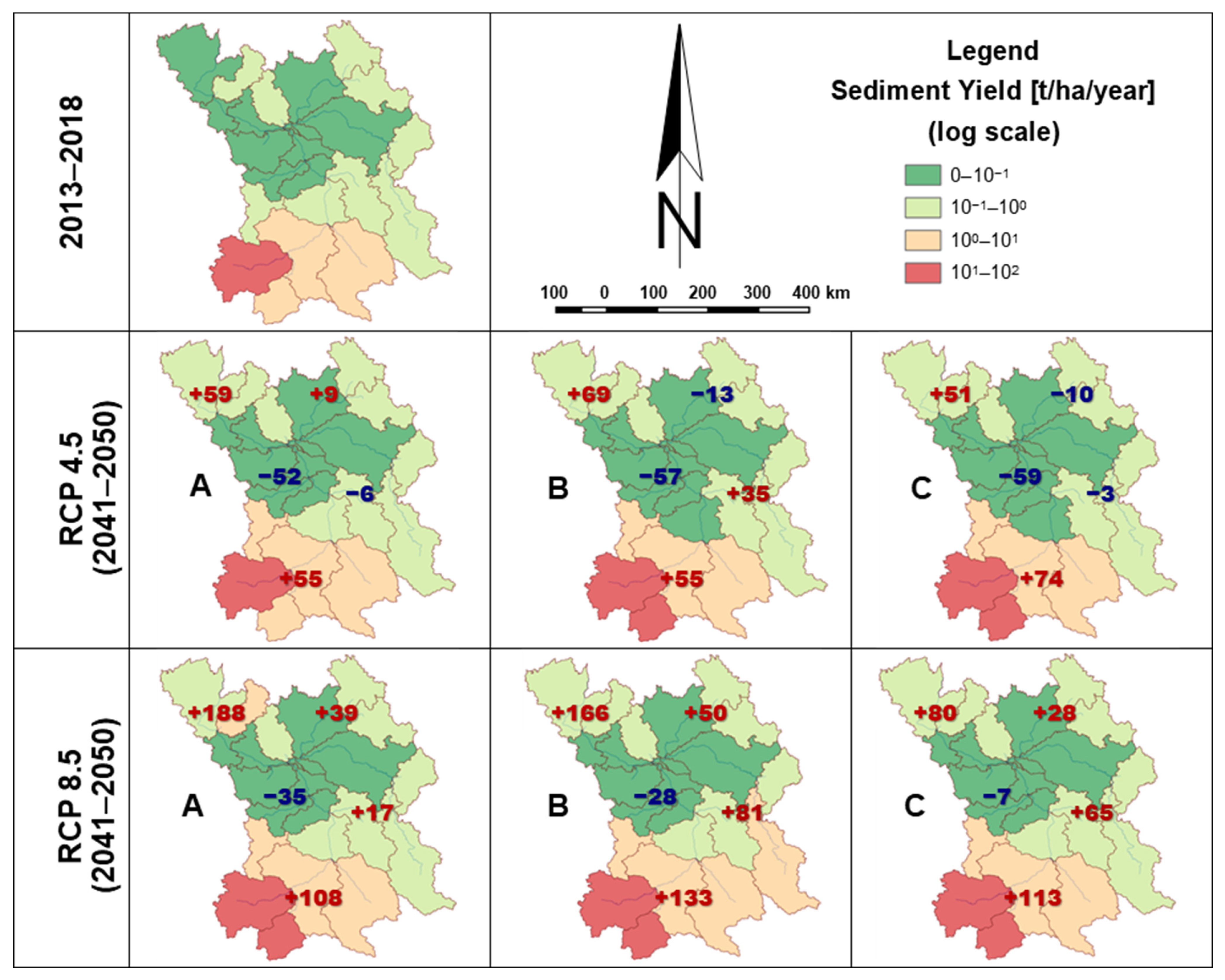 5.4. Comparative Analysis of Sediment Yield Changes Relative to the 2013–2018 Baseline