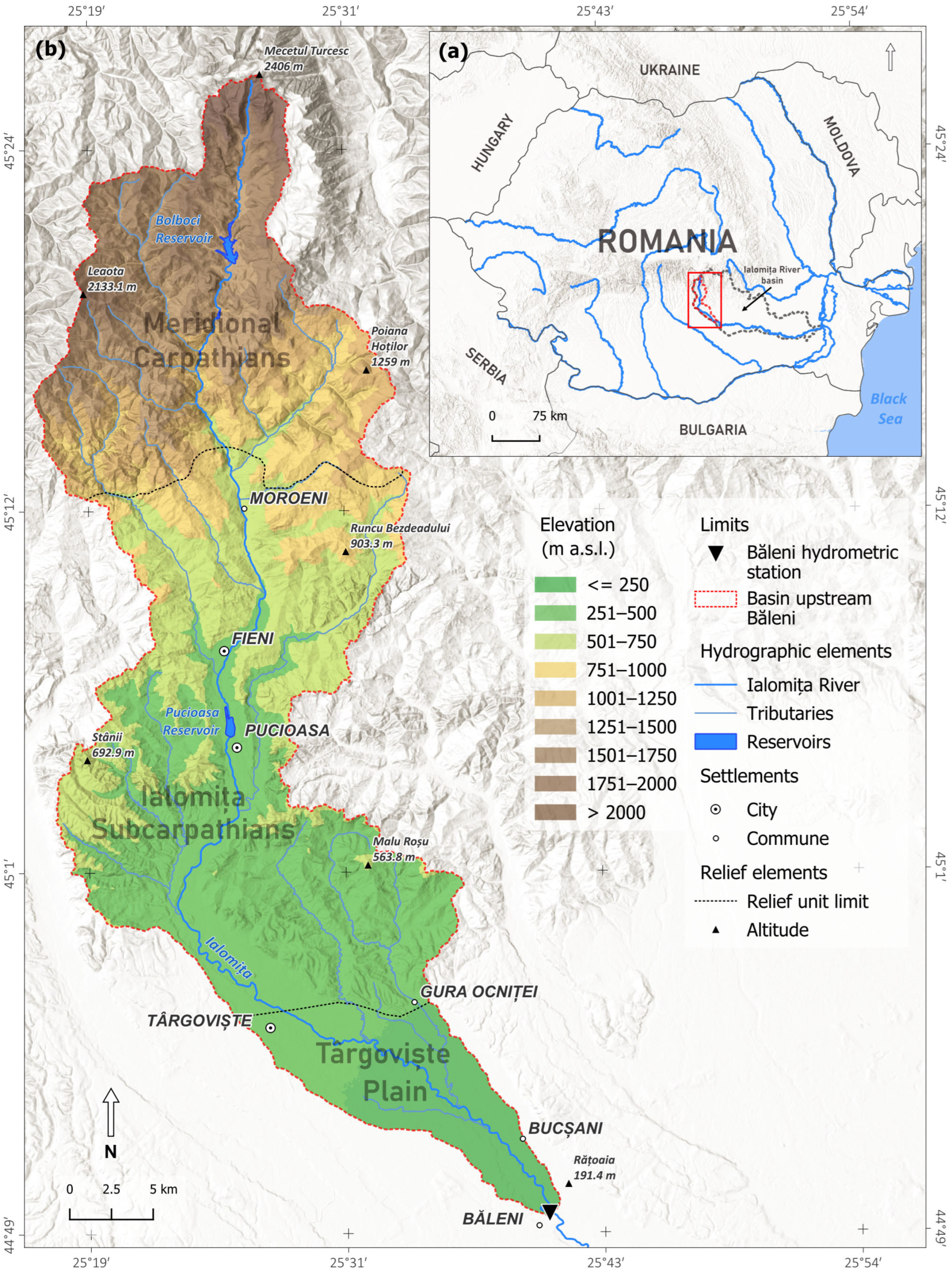 - Murărescu, O.; Bretcan, P. Management of Water Resources in Upper Ialomiţa River Basin (Carpathians, Sub-Carpathians, Romania). In Proceedings of the International Symposium on Water Management and Hydraulic Engineering, Faculty of Civil Engineering, Department of Hydraulics, Hydrology and River Engineering, University of Ss. Cyril and Methodius, Skopje, North Macedonia, 1–5 September 2009. [Google Scholar]
