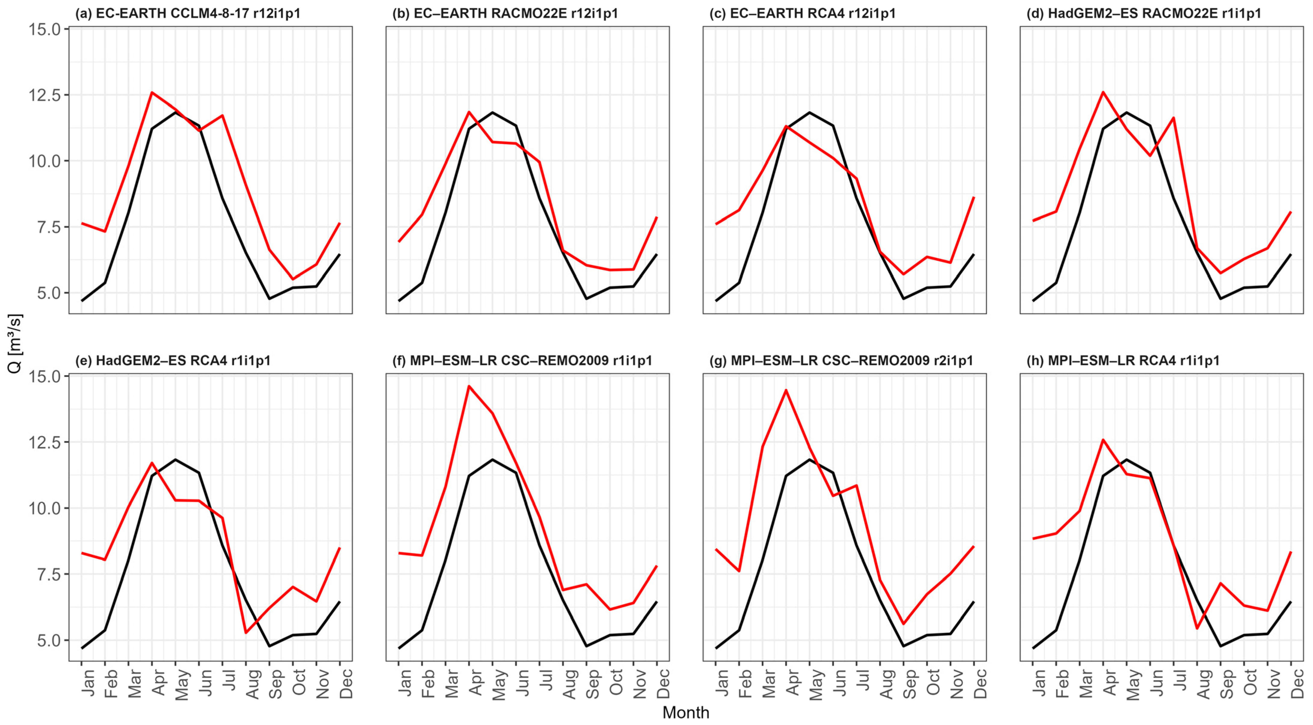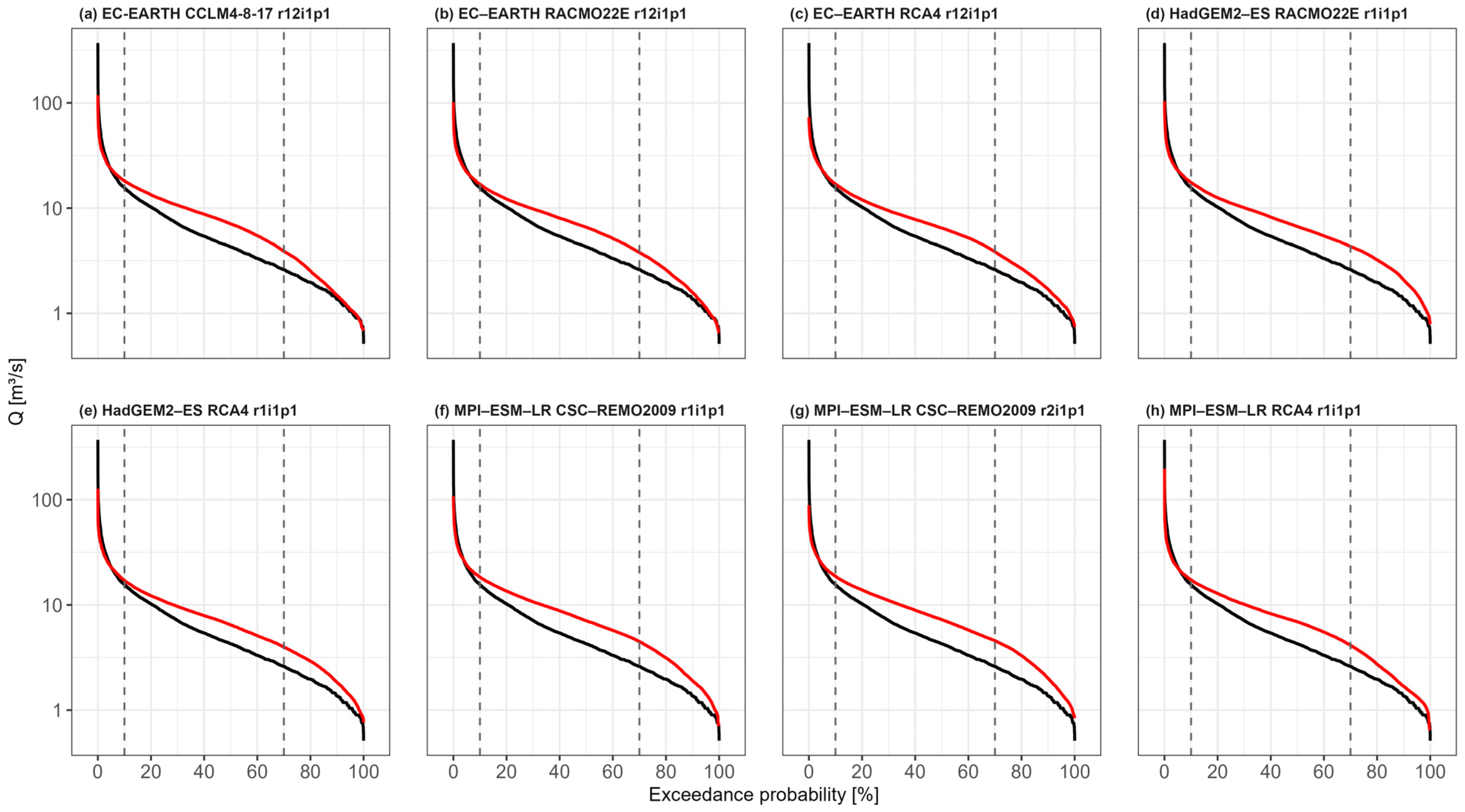 - Climate models and climate change scenarios: The eight climate models used to produce meteorological forcing (temperature and precipitation) for the hydrological model introduce limitations and uncertainties in the simulated outputs. First, using only a subset (eight members) of the EURO–CORDEX EUR–11 ensemble results in an incomplete representation of possible future climate conditions. Structural differences in model formulation, including the representation of physical processes and parametrisation, lead to structural uncertainty, with model outputs varying even under the same climate change scenario forcing. In addition, for the RCP scenarios considered in this study, uncertainties increase with advancing time. Although the climate model outputs are bias-adjusted, uncertainties remain, particularly for high precipitation values.