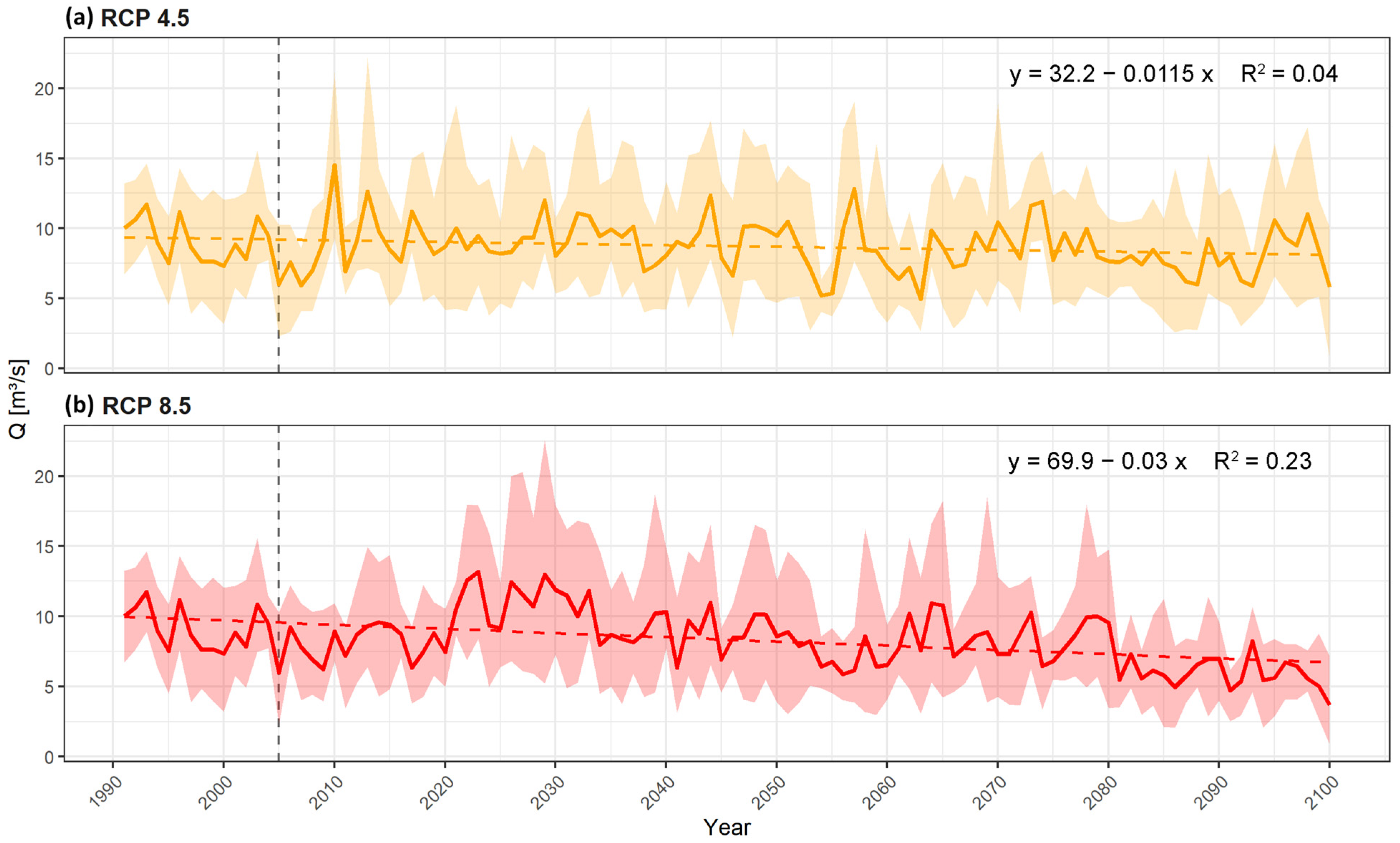- The future periods will begin in 2031, considering that the current decade is halfway through. The periods for projected discharges will maintain the 30-year window, and will advance decadal until 2100. Five future periods are outlined, each overlapping by 20 years: 2031–2060, 2041–2070, 2051–2080, 2061–2090, and 2071–2100. We select this approach because it is suitable for identifying an evolutionary trend and smoothing the variability.