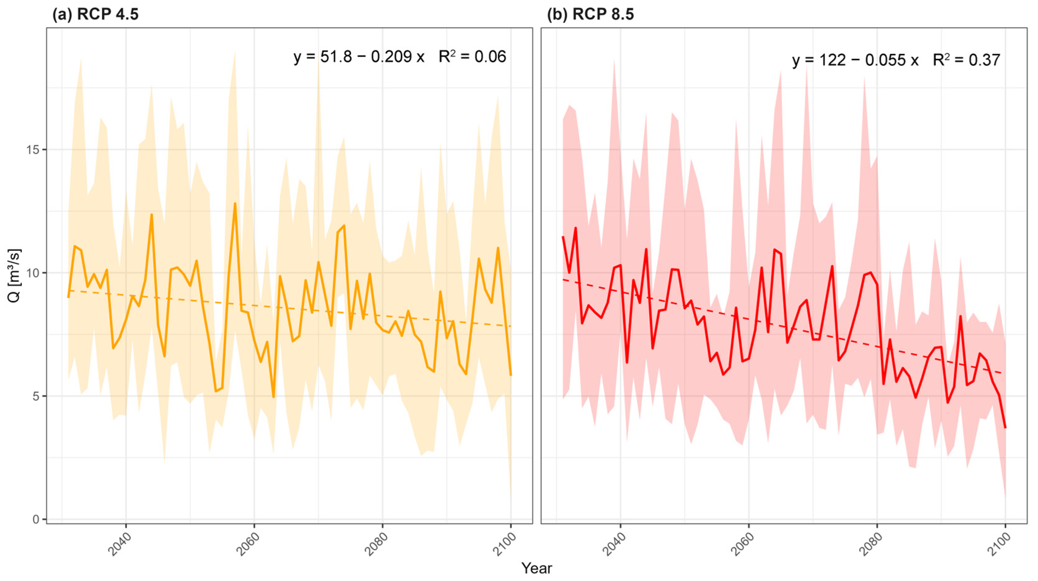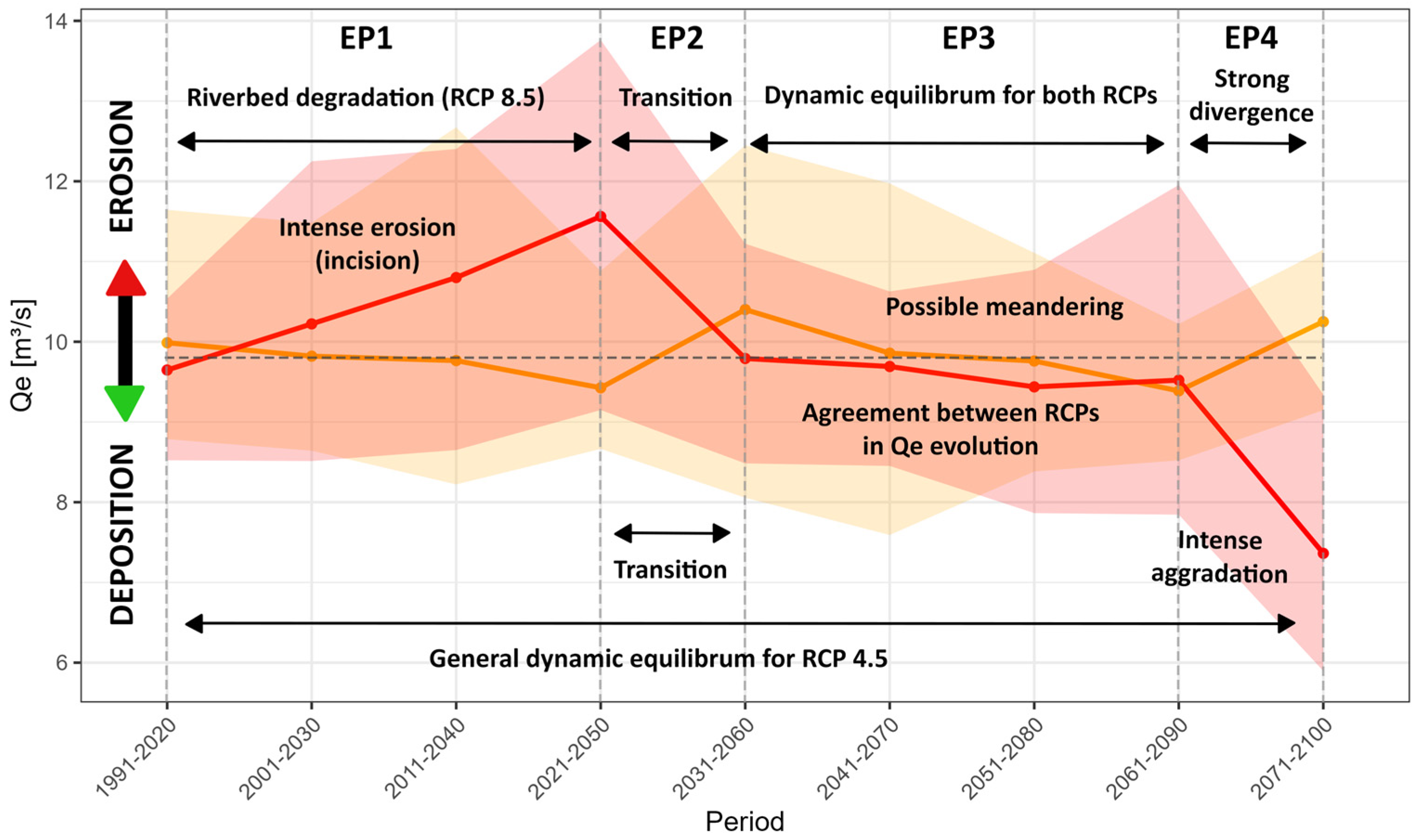 - EP2 (up to 2060)—a transition period in the middle of the century, where the two scenarios intersect and change their general direction of evolution. In the RCP 8.5 scenario, the riverbed potential starts a sudden process of deposition in an already incised channel, which will continue until the end of the analysis period. Qe4.5 returns above the reference value, where a slight erosion process can occur.